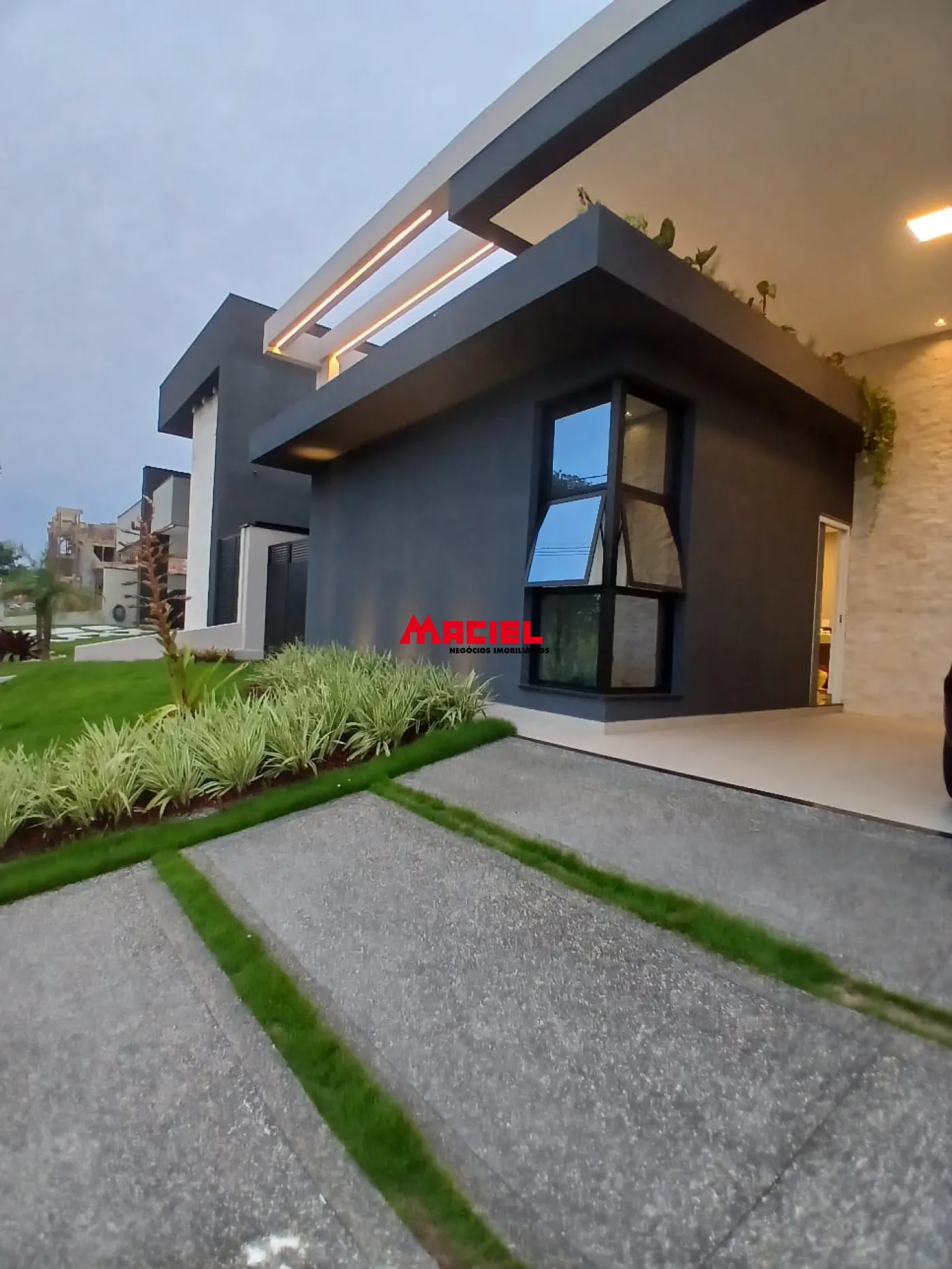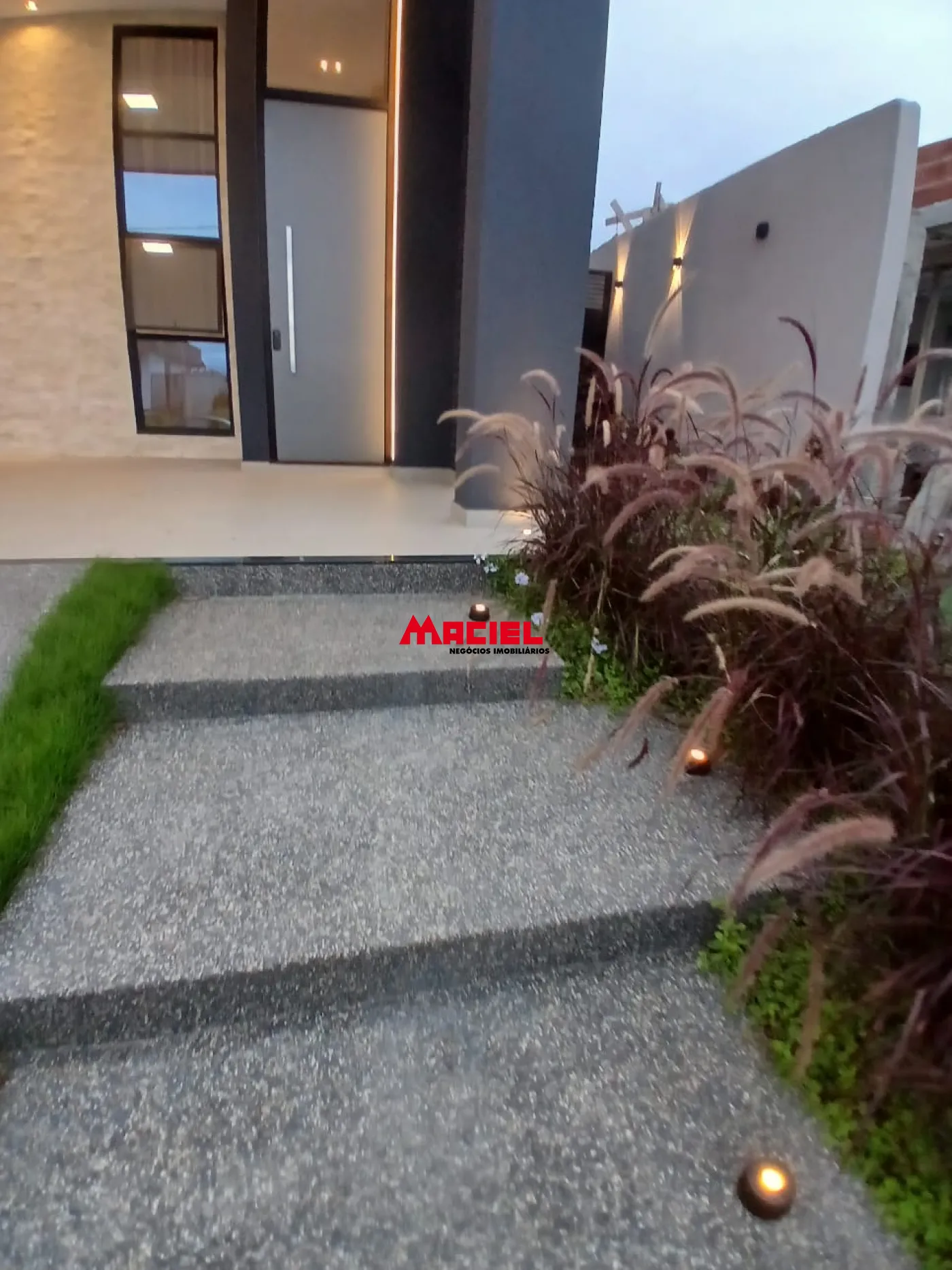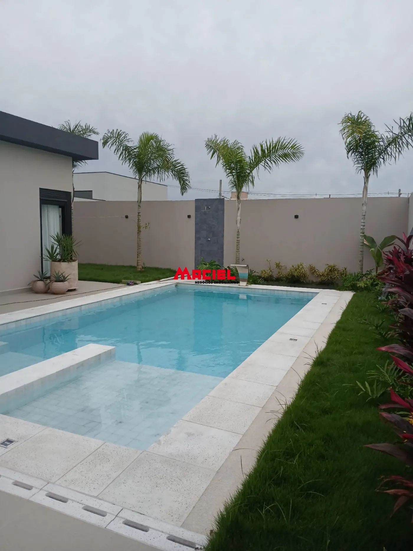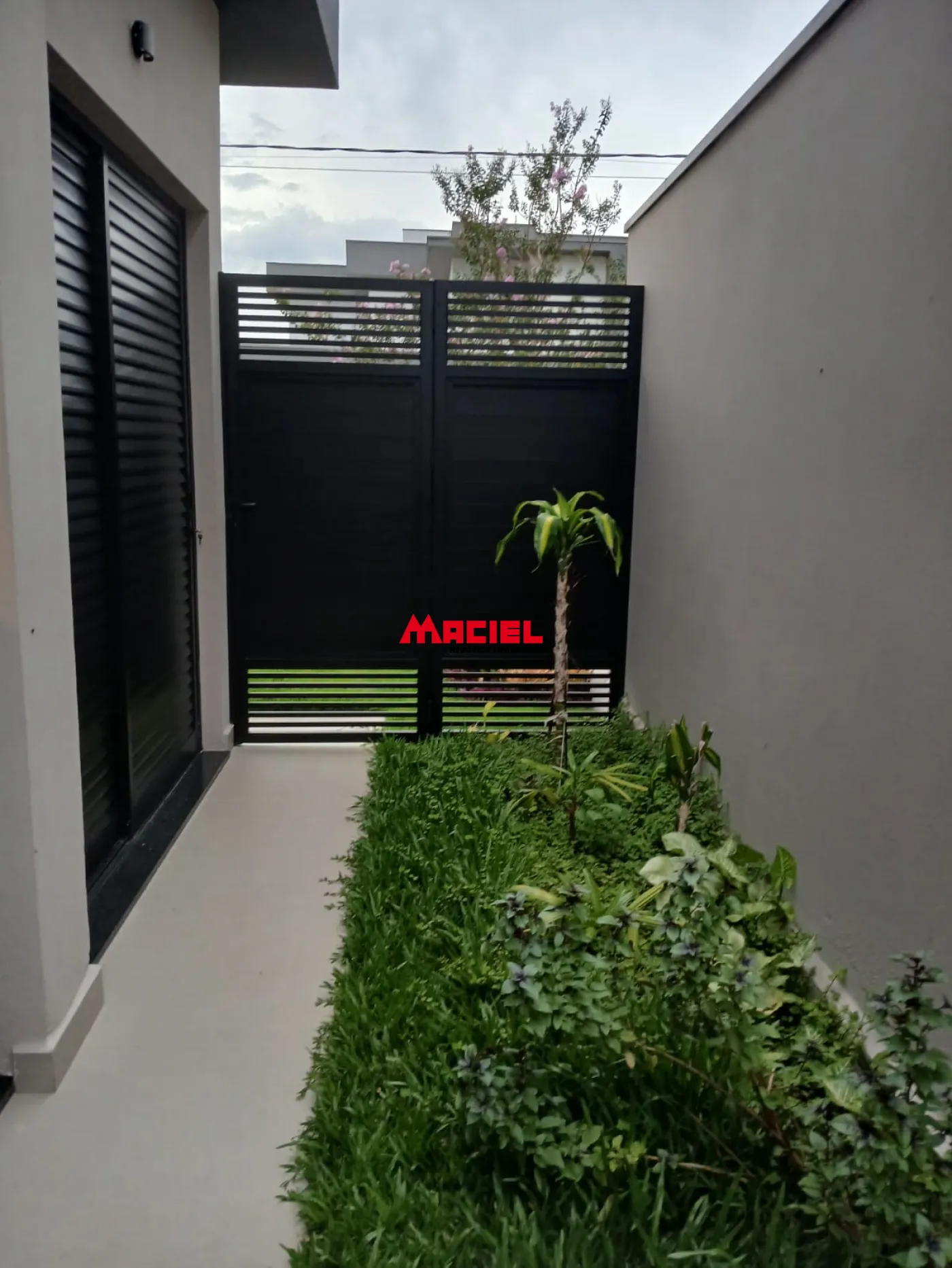 Paisagismo completo e várias palmeiras.