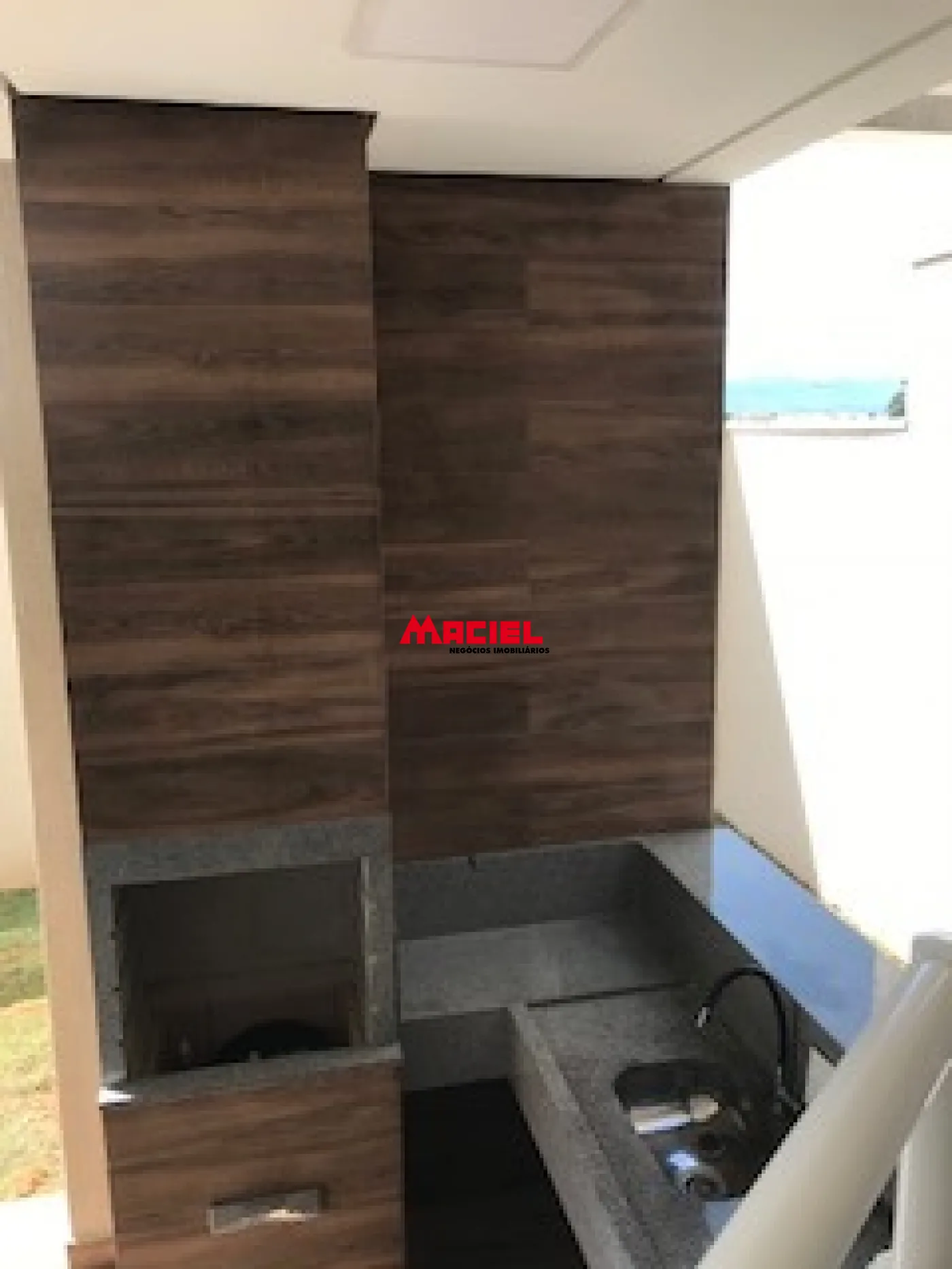 Amplo espaço da área gourmet com churrasqueira, pia, balcão em granito, lavabo e home box.