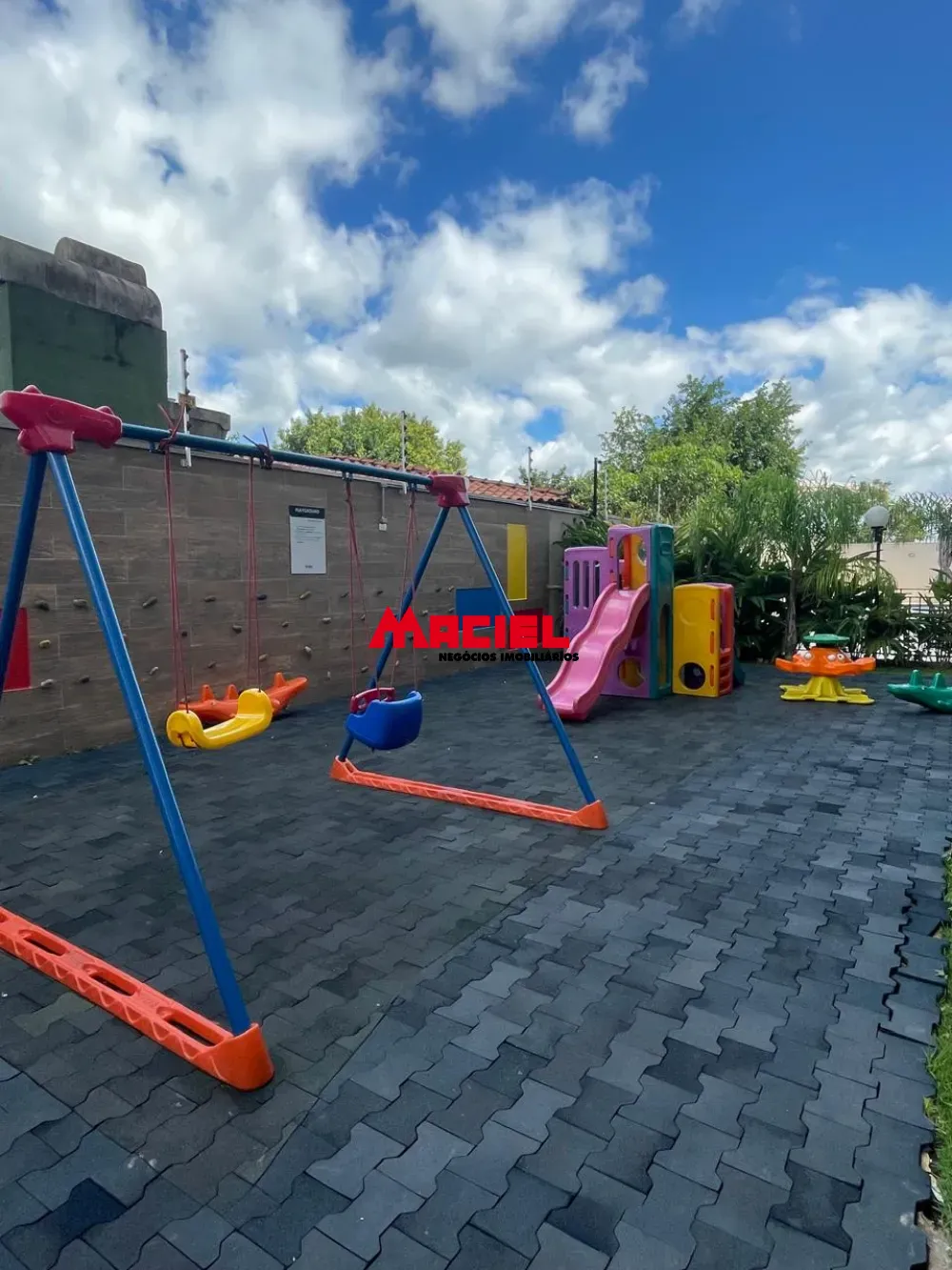 Possui parquinho com diferentes brinquedos, salão de festas, área de fitness.