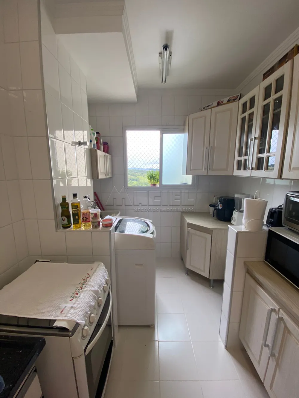 Cozinha planejada com fogão, geladeira e máquina de lavar roupa