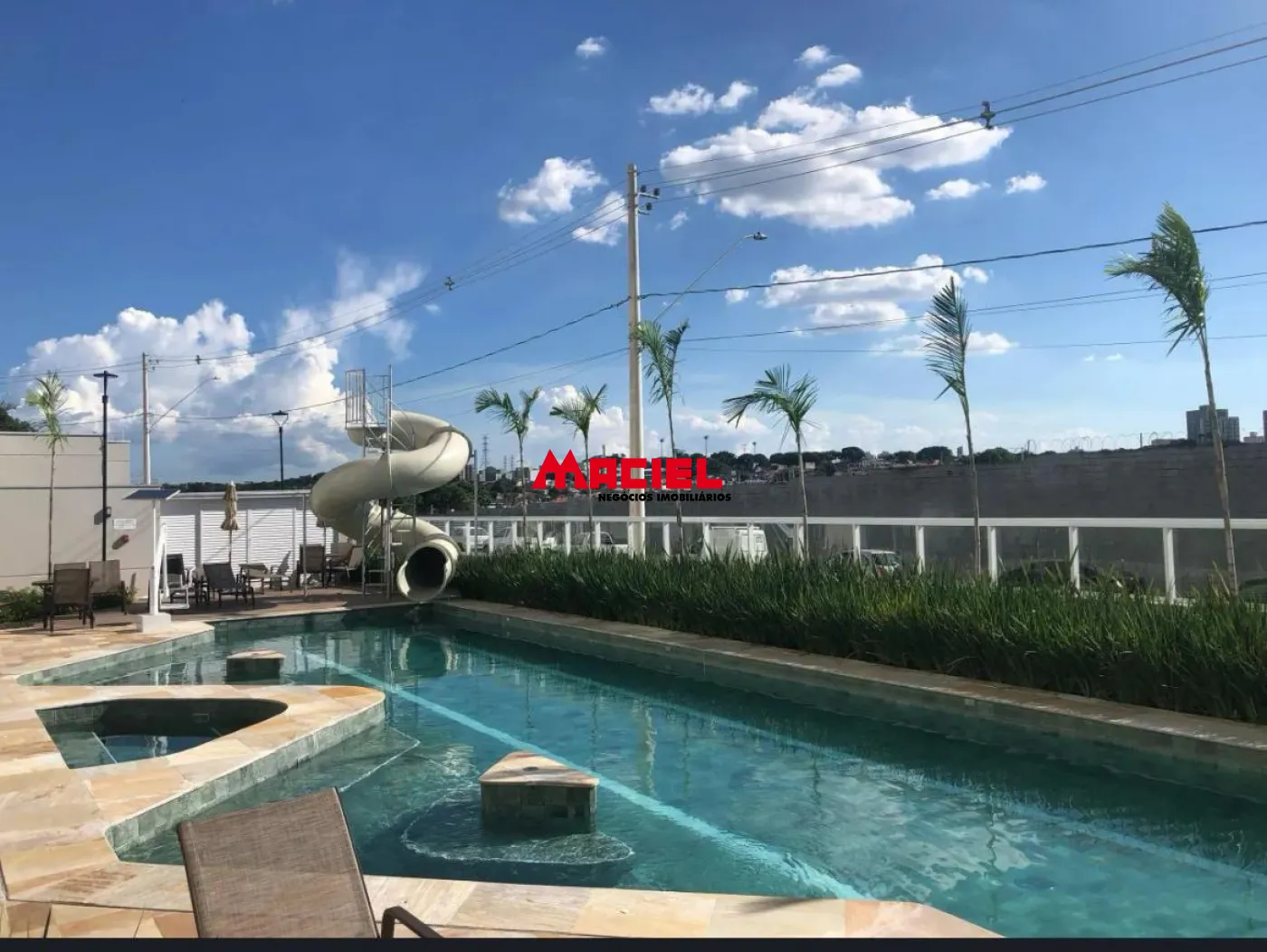 Piscina adulto com tobogã e piscina infantil com escorregador