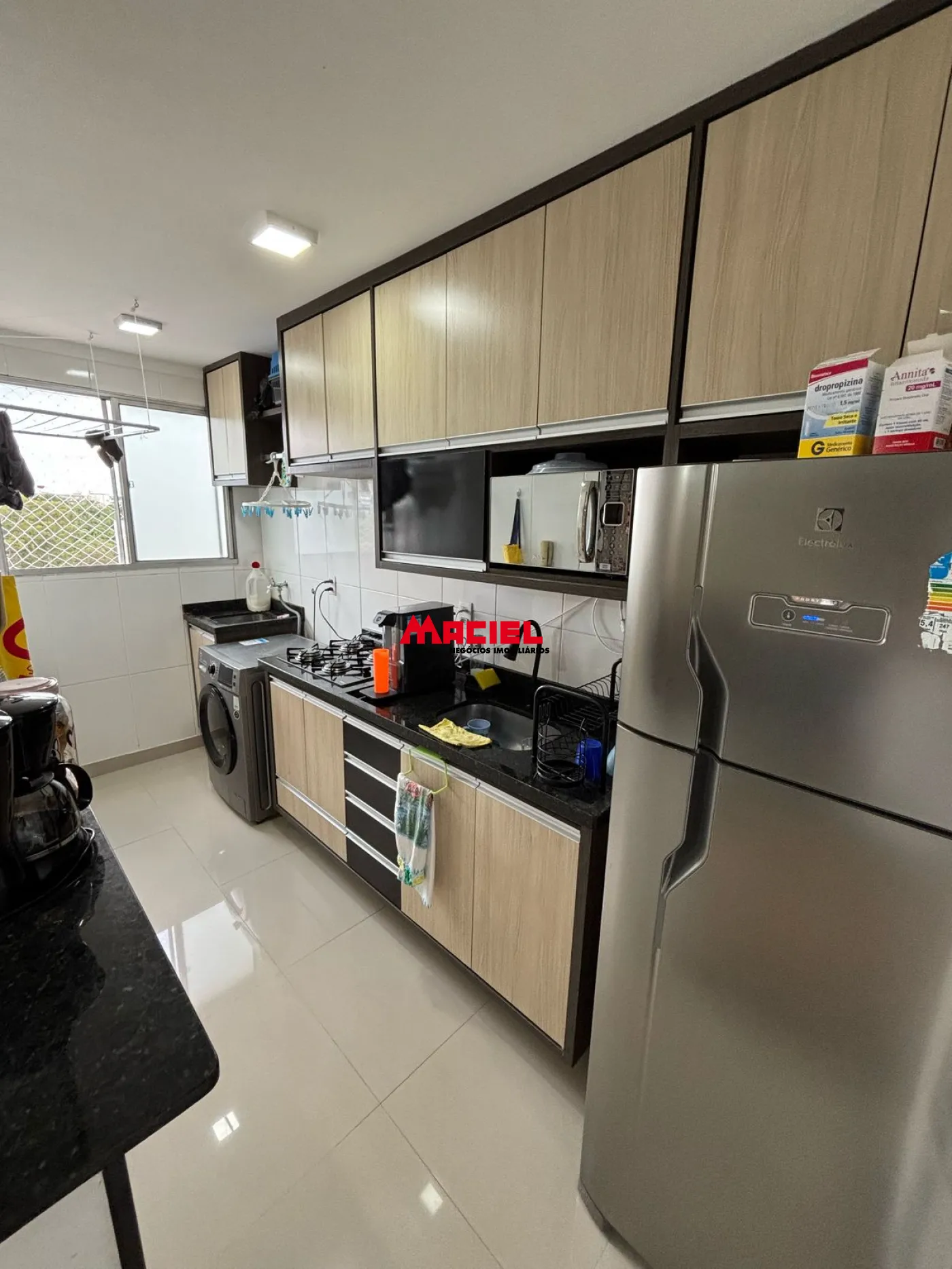 Cozinha em porcelato, cerâmica até o teto, cooktop, tanque embutido, armários planejados;