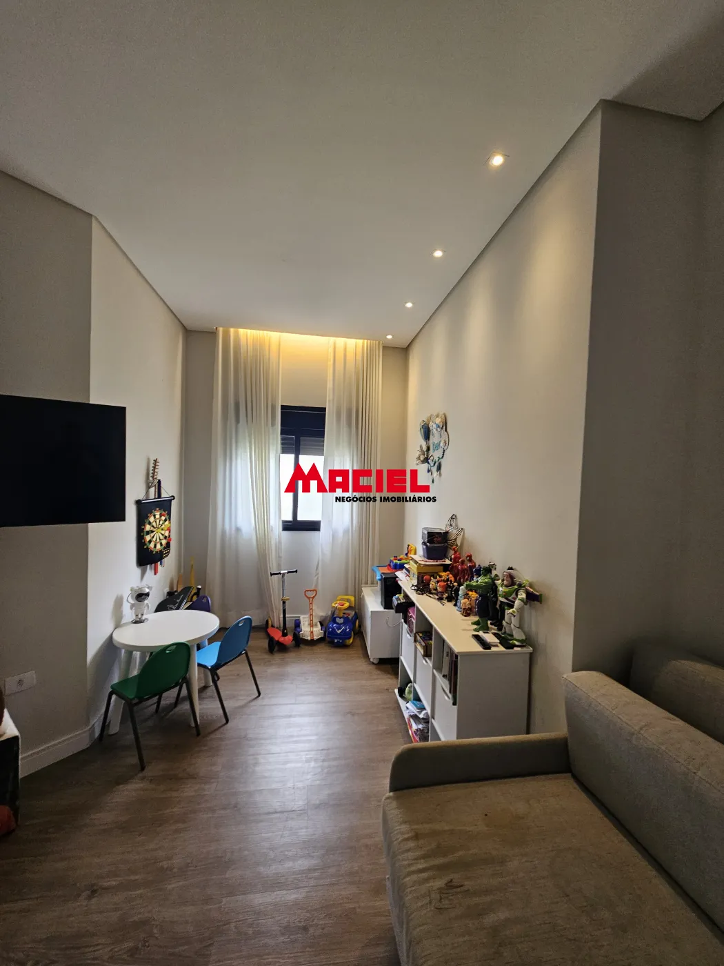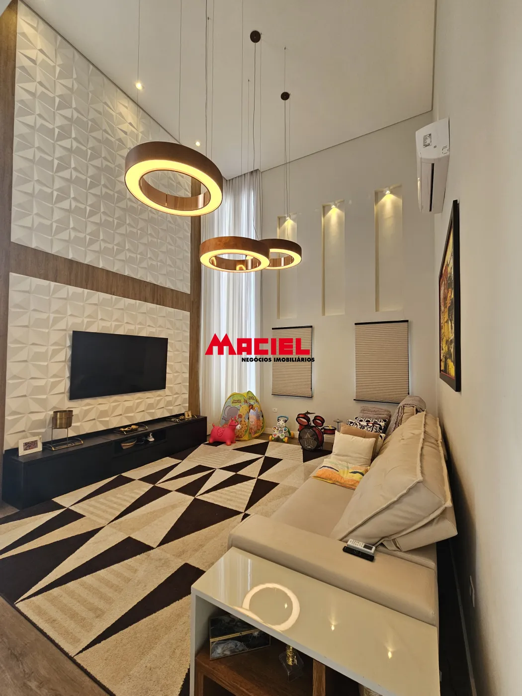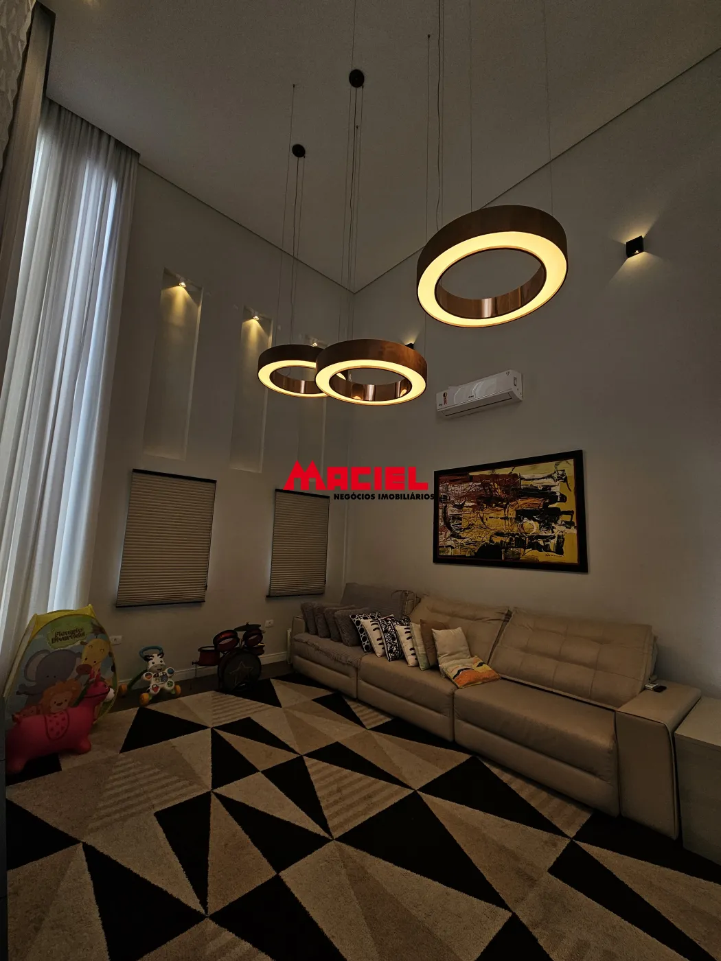 Sala de TV espaçosa com pé-direito duplo e acabamento impecável.