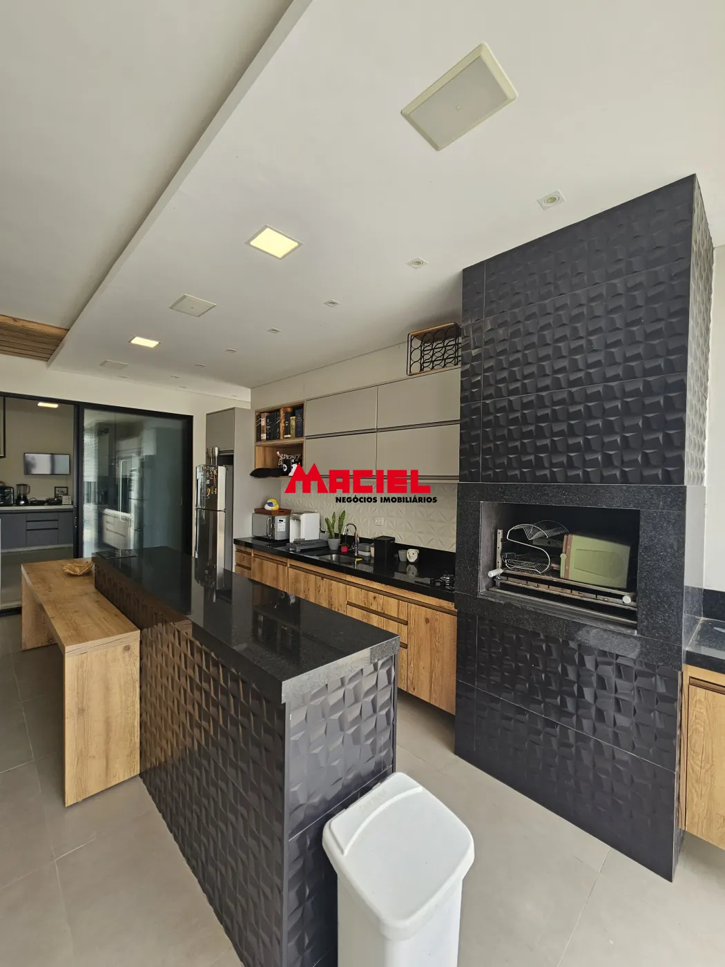 Área de lazer integrada com churrasqueira, fogão, piscina com sauna e hidromassagem.