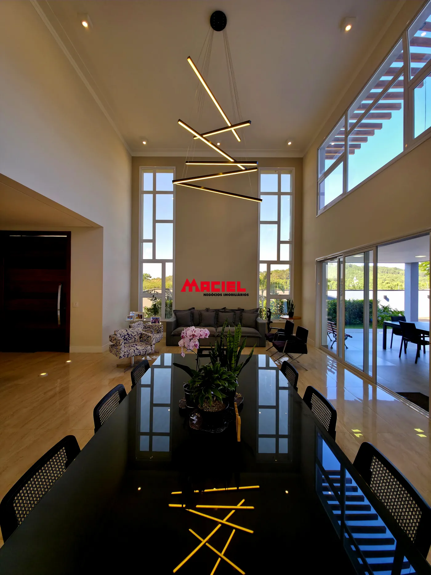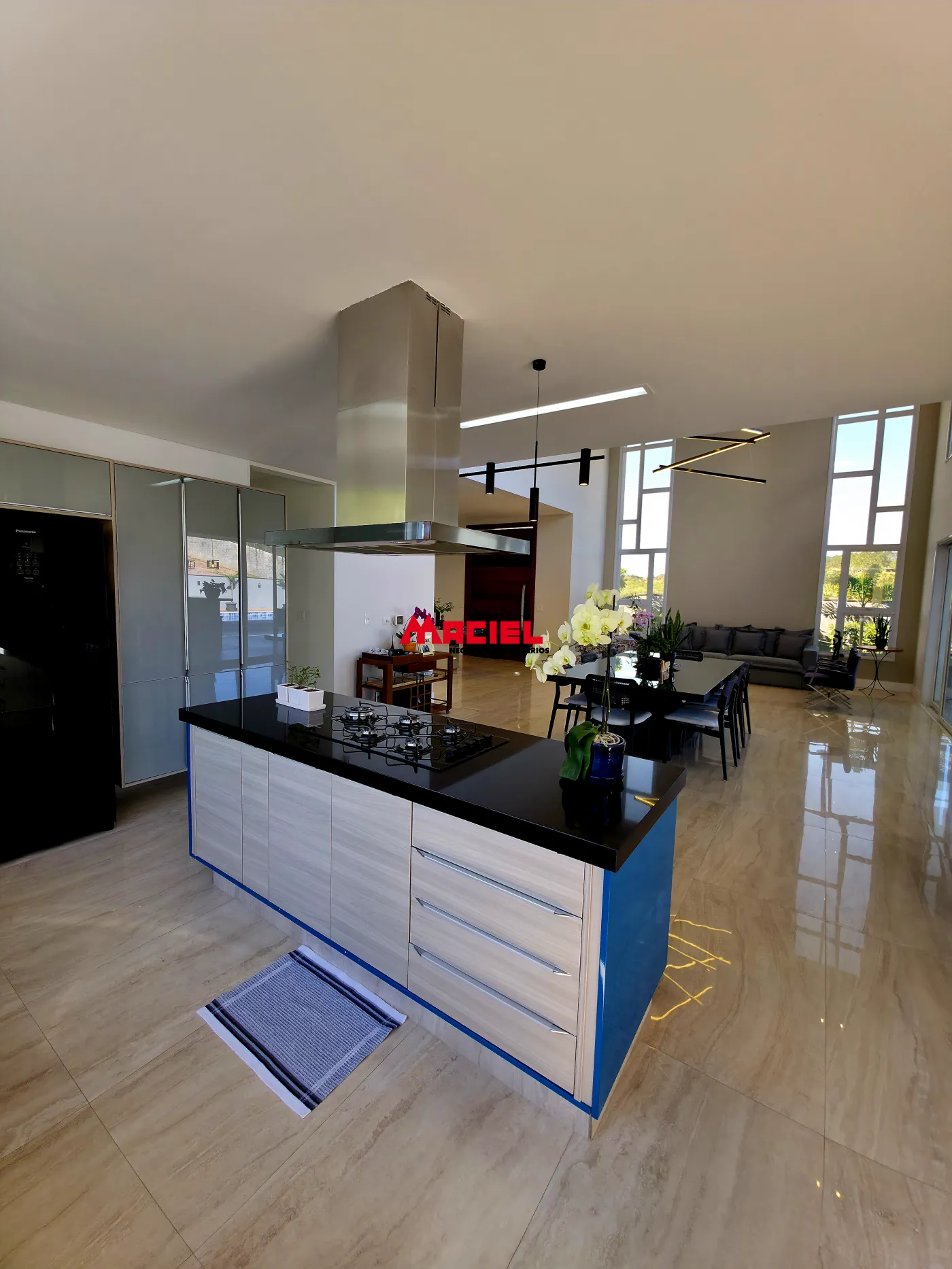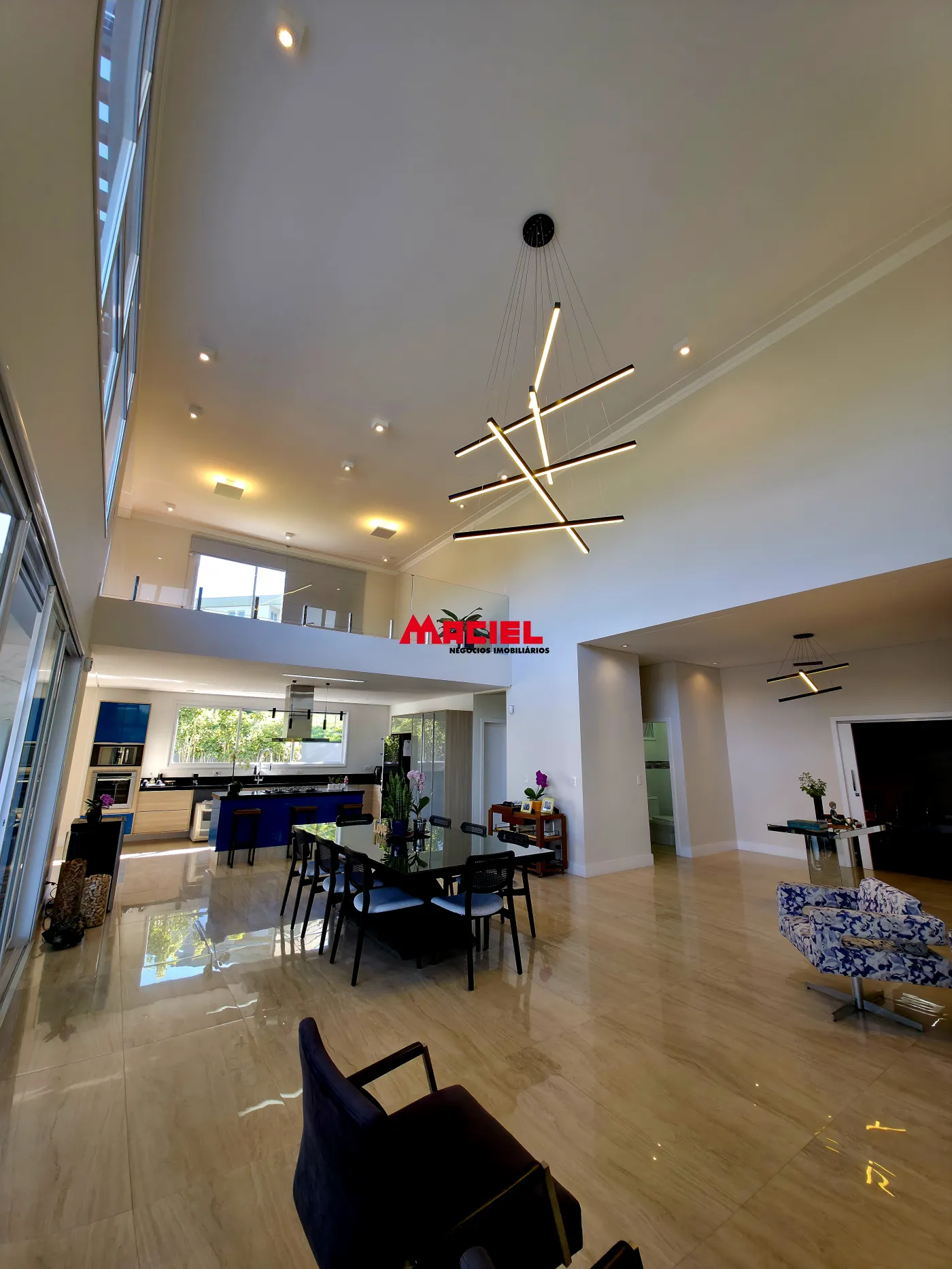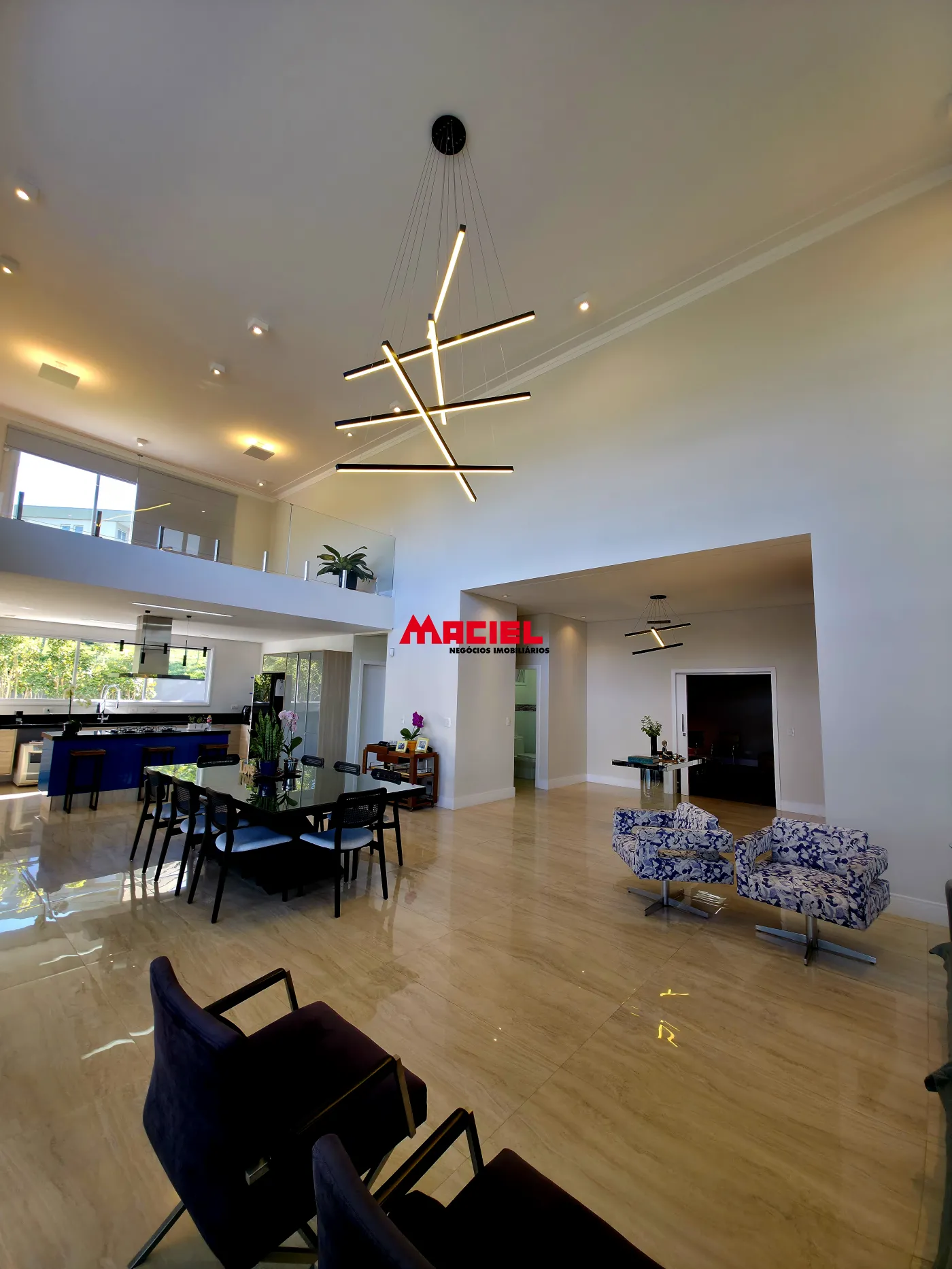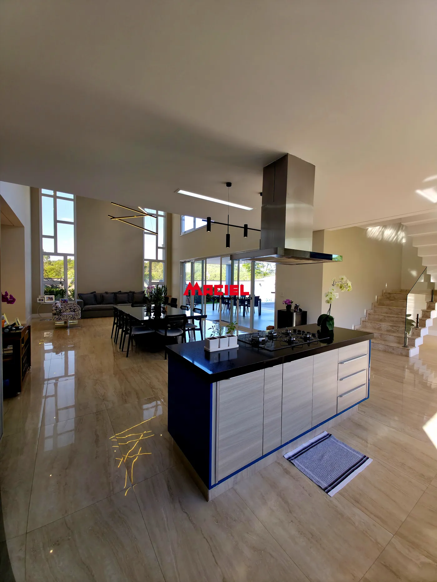 Salas integradas, unindo estar, jantar e cozinha em conceito aberto.