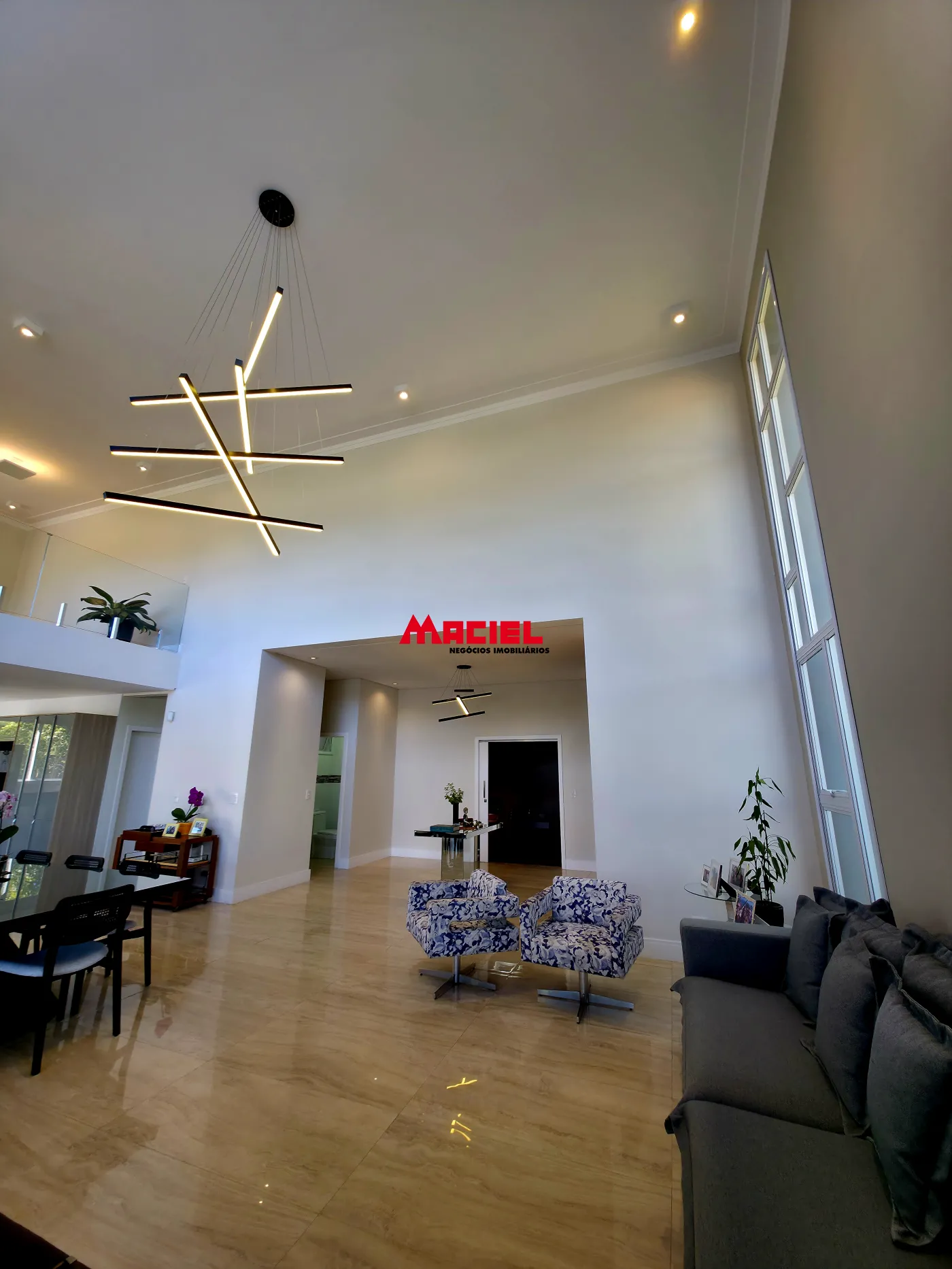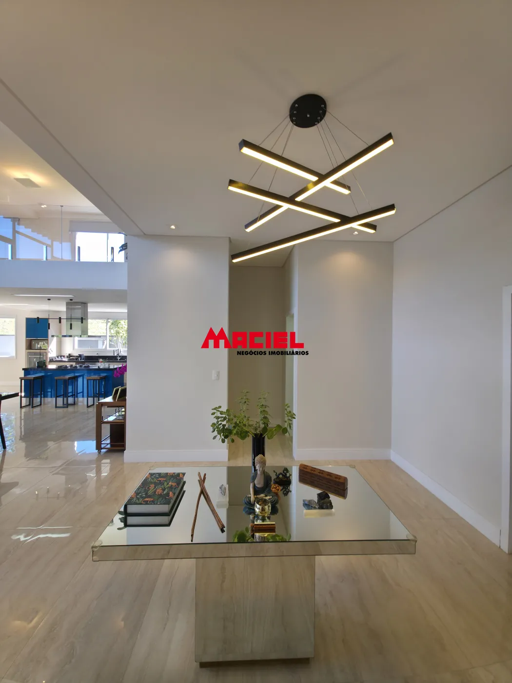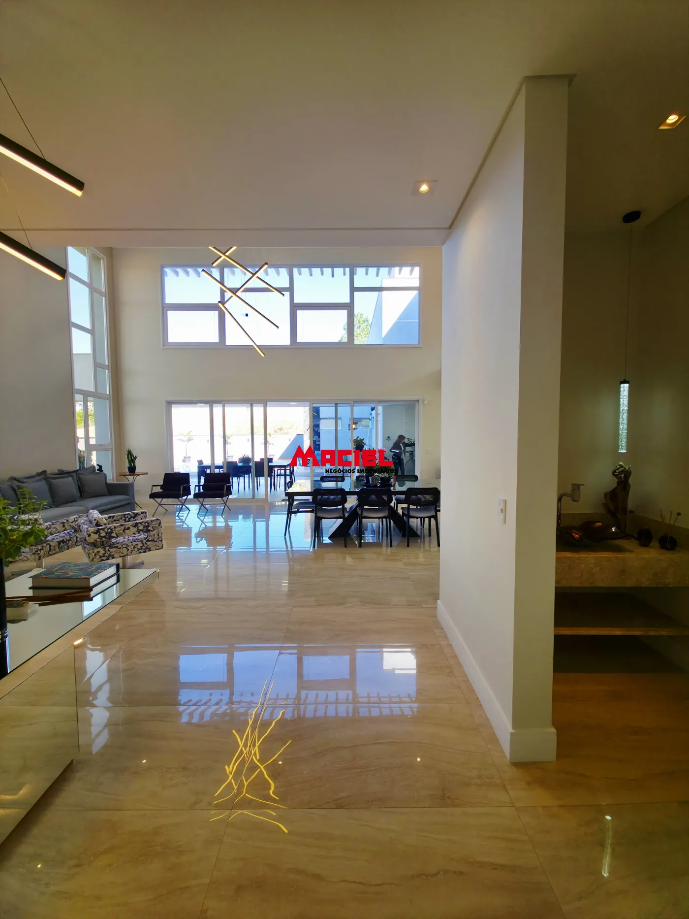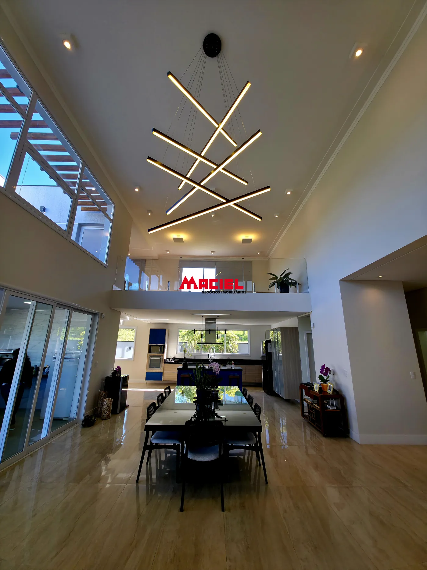 Salas integradas, unindo estar, jantar e cozinha em conceito aberto.