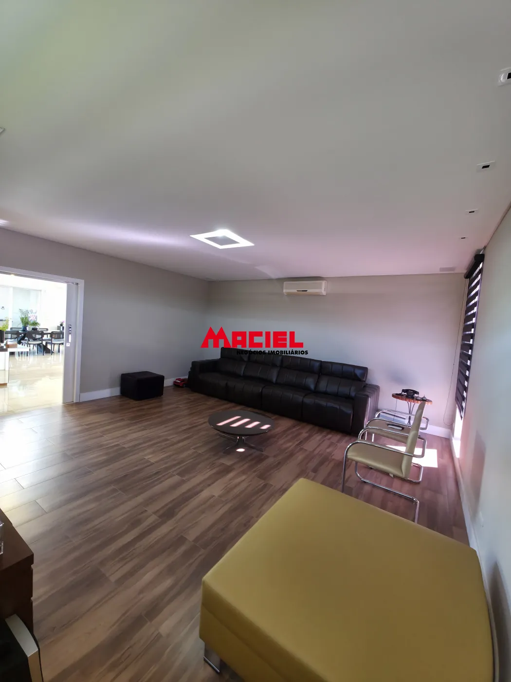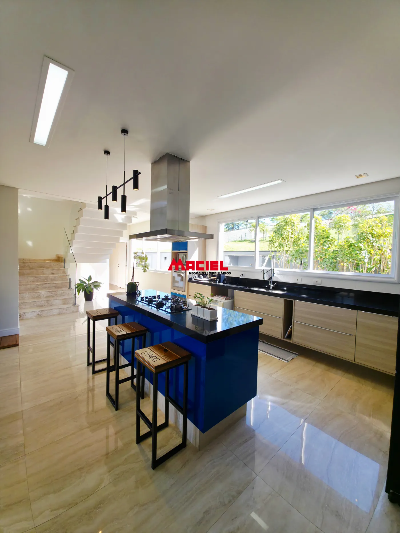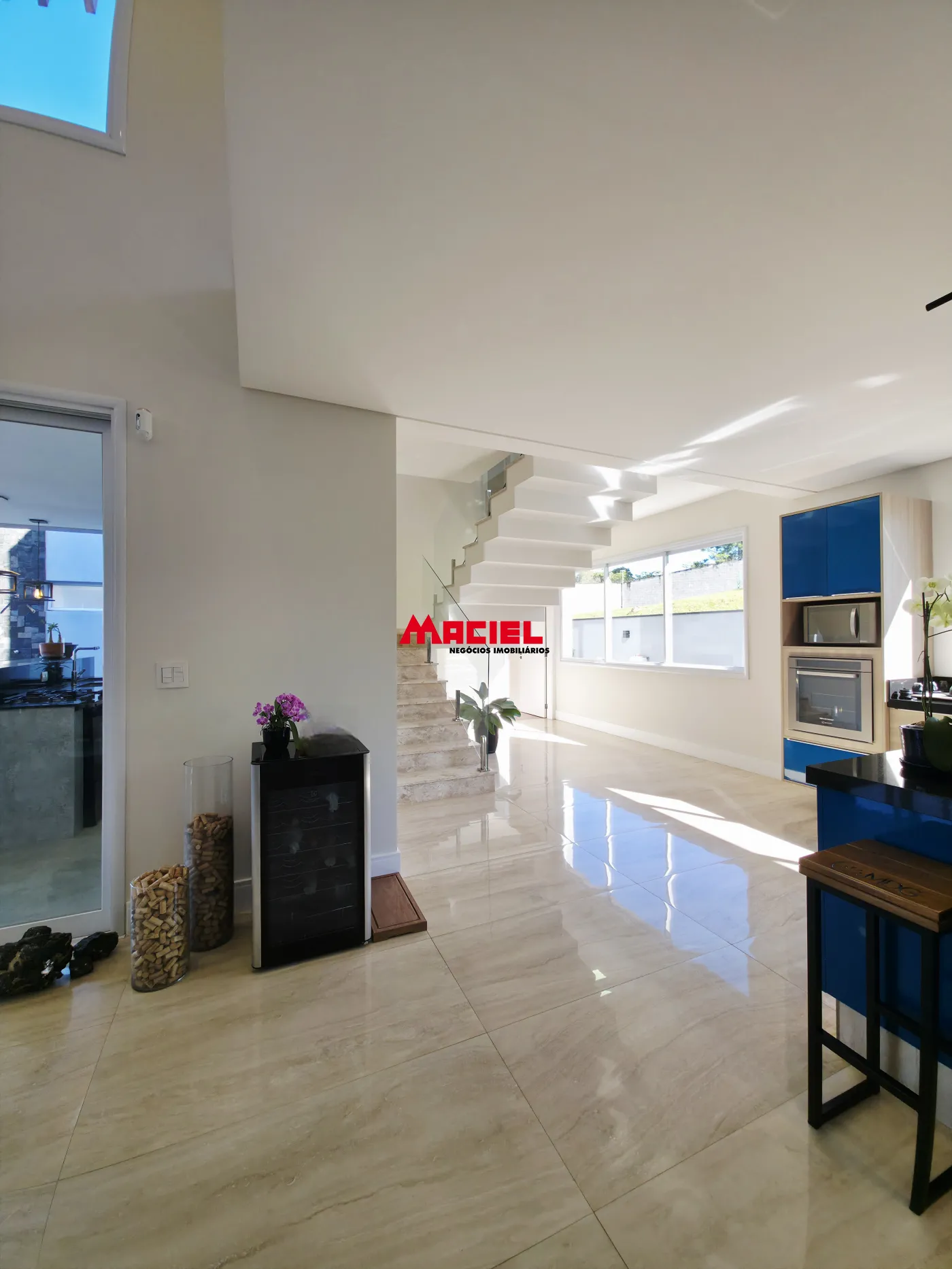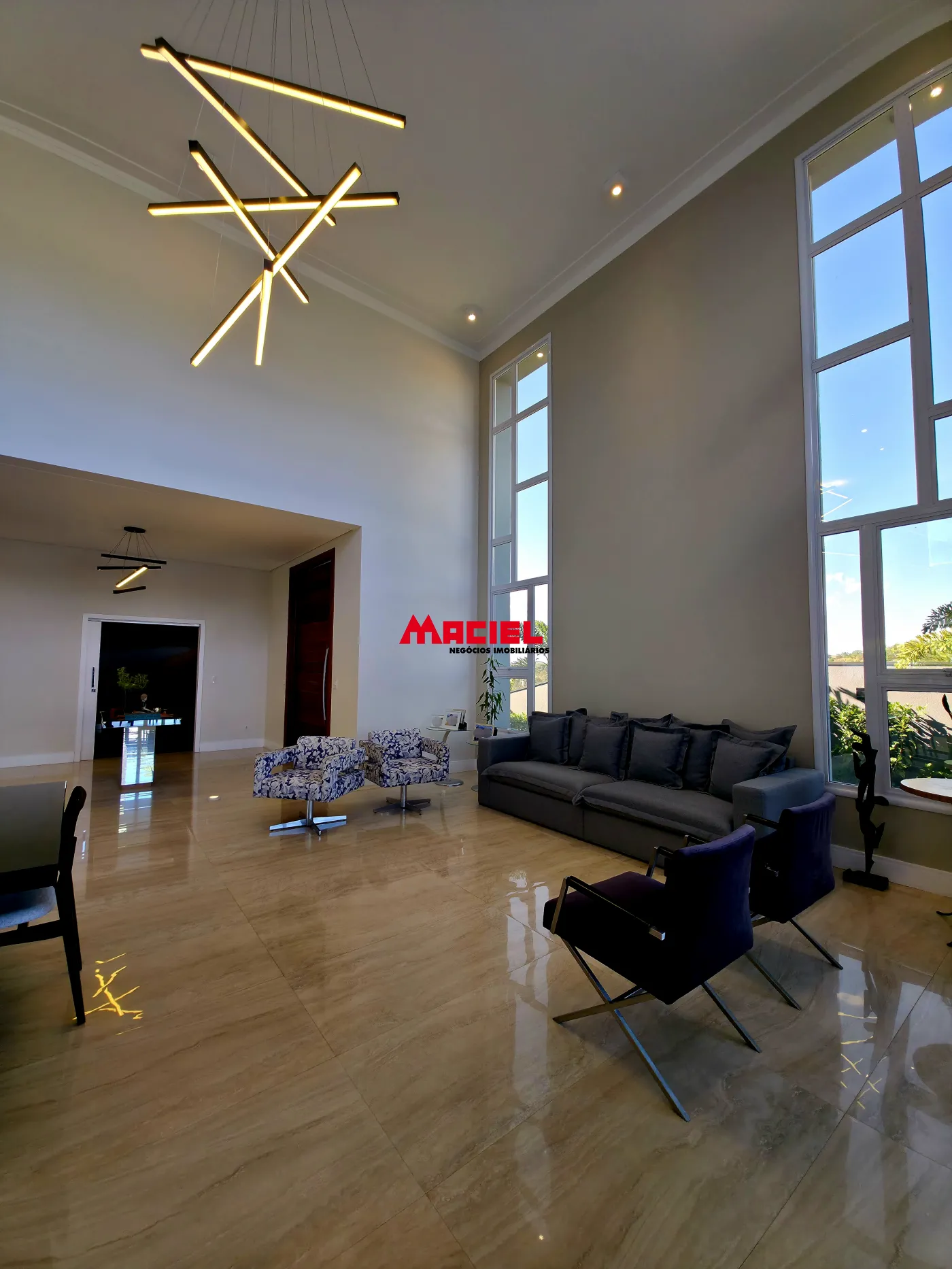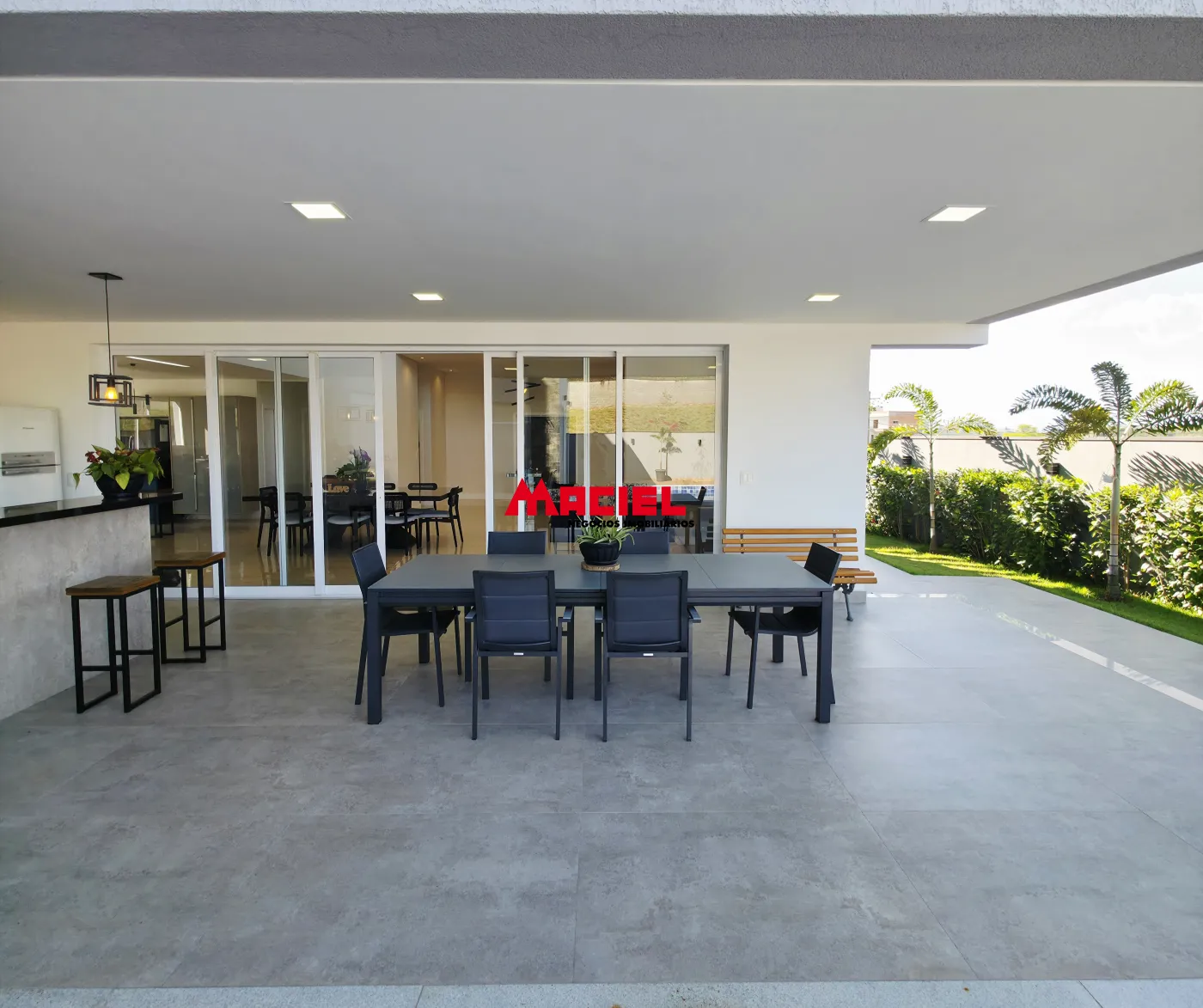 Salas integradas, unindo estar, jantar e cozinha em conceito aberto.