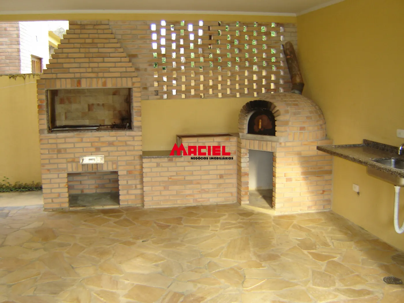 Espaço gourmet com churrasqueira, forno a lenha e forno de pizza