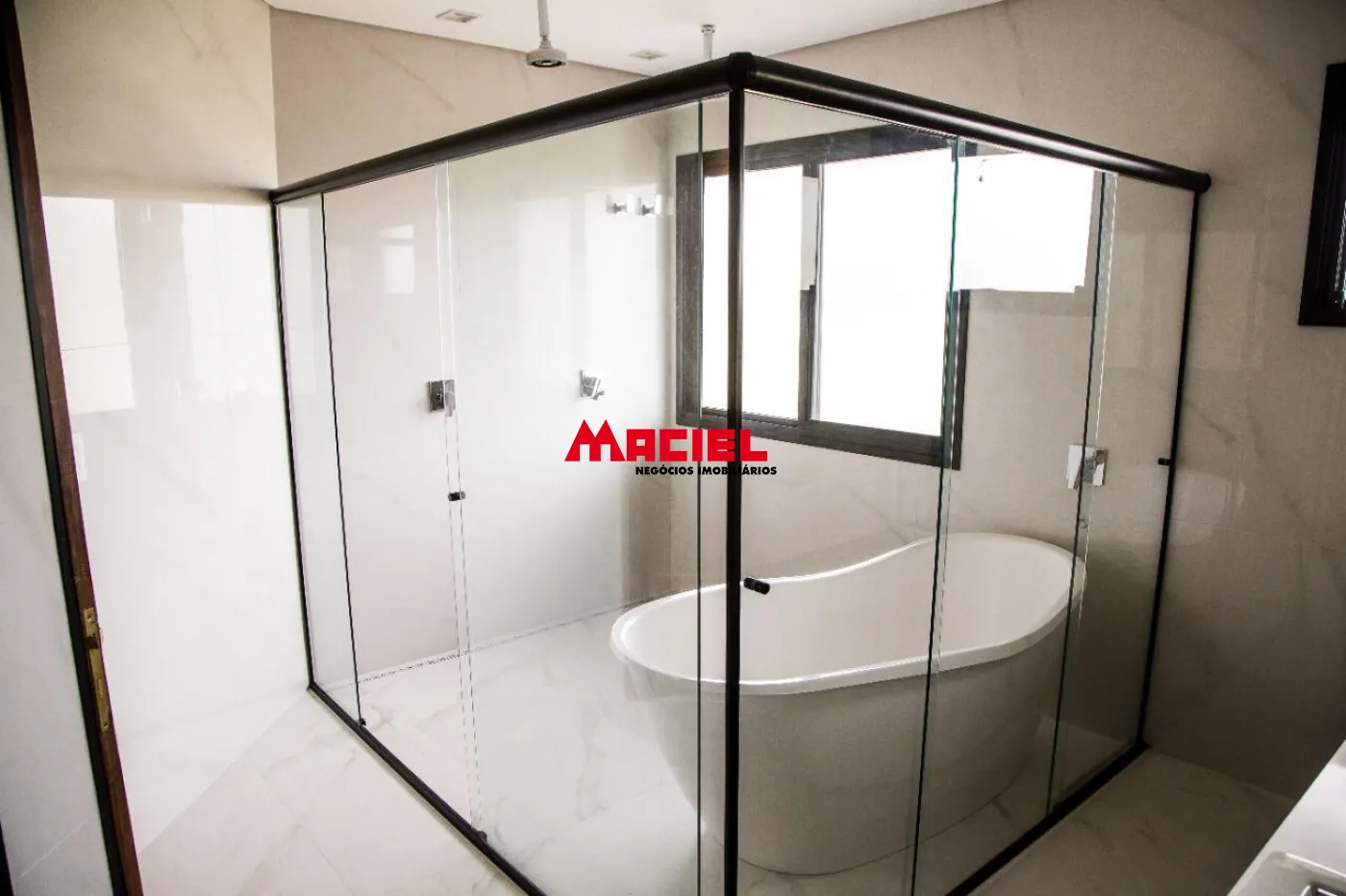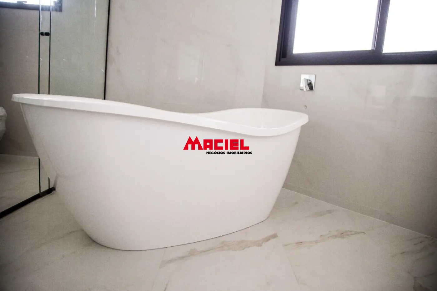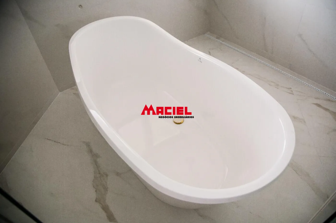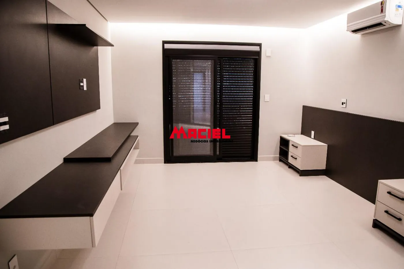 2 suítes master, ambas com banheira e 2 chuveiros e 2 pias de lavatório e armários planejados, e escritório.