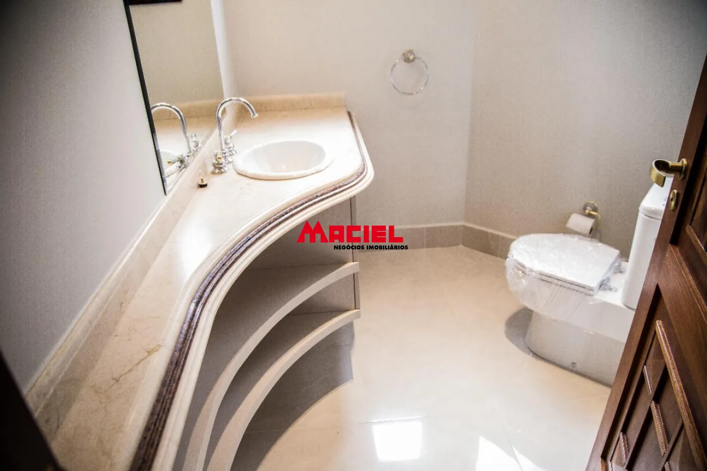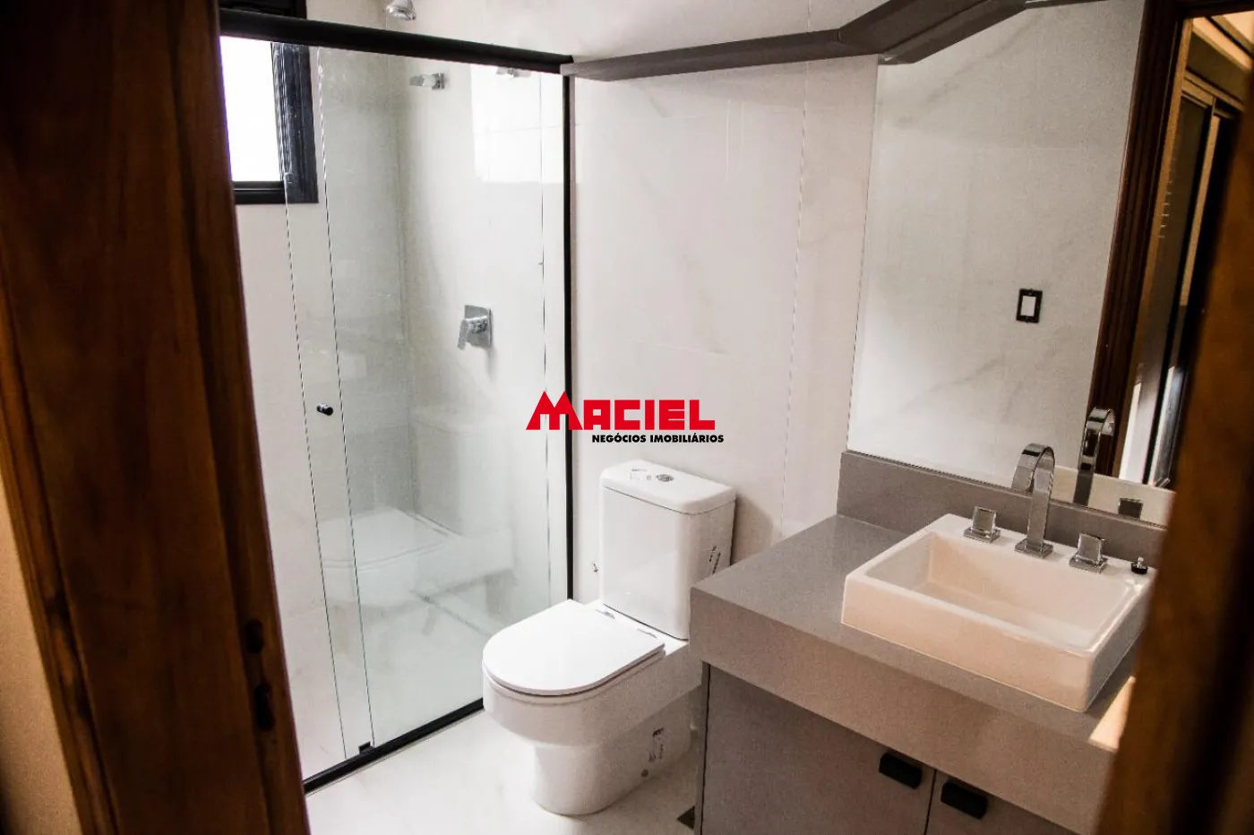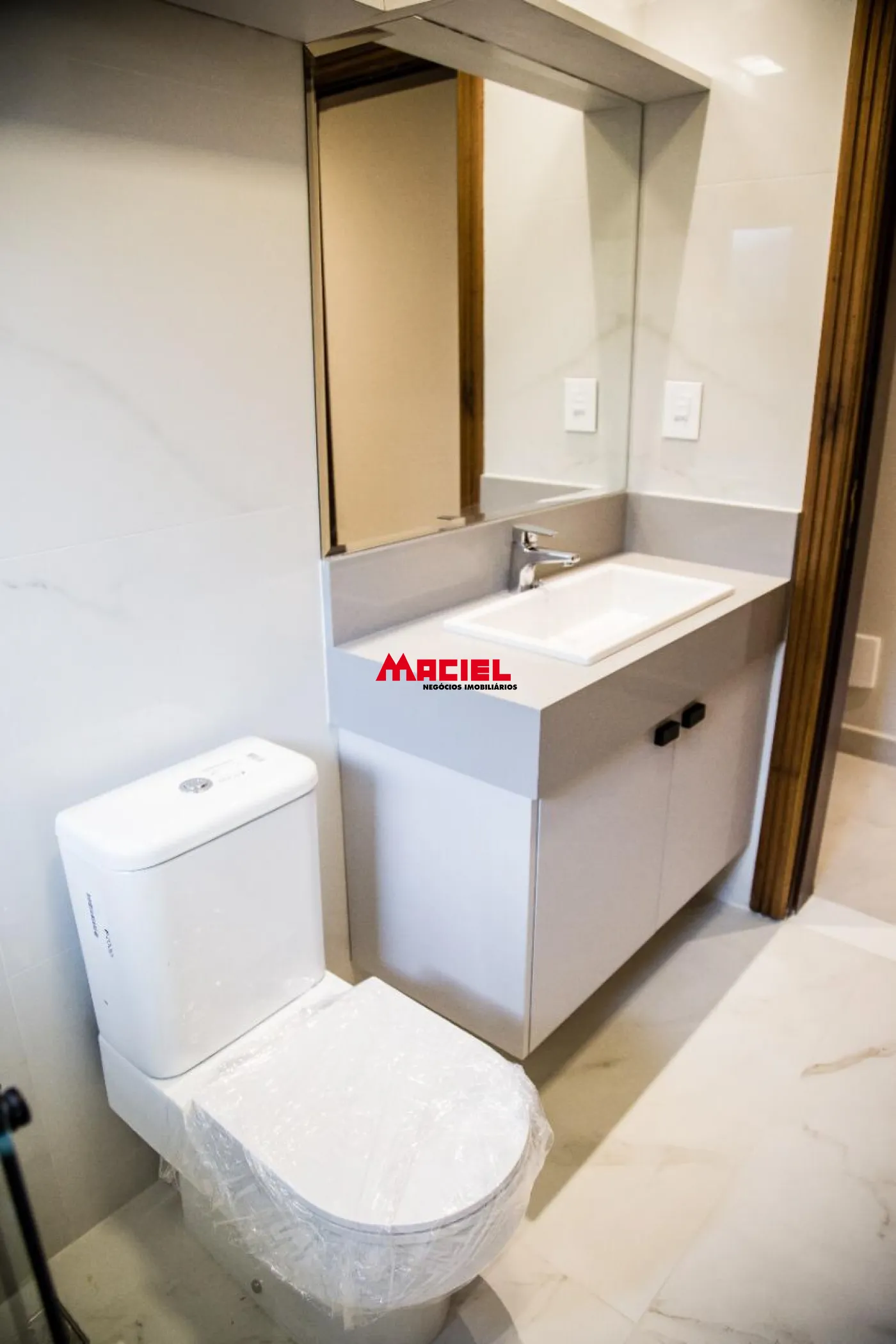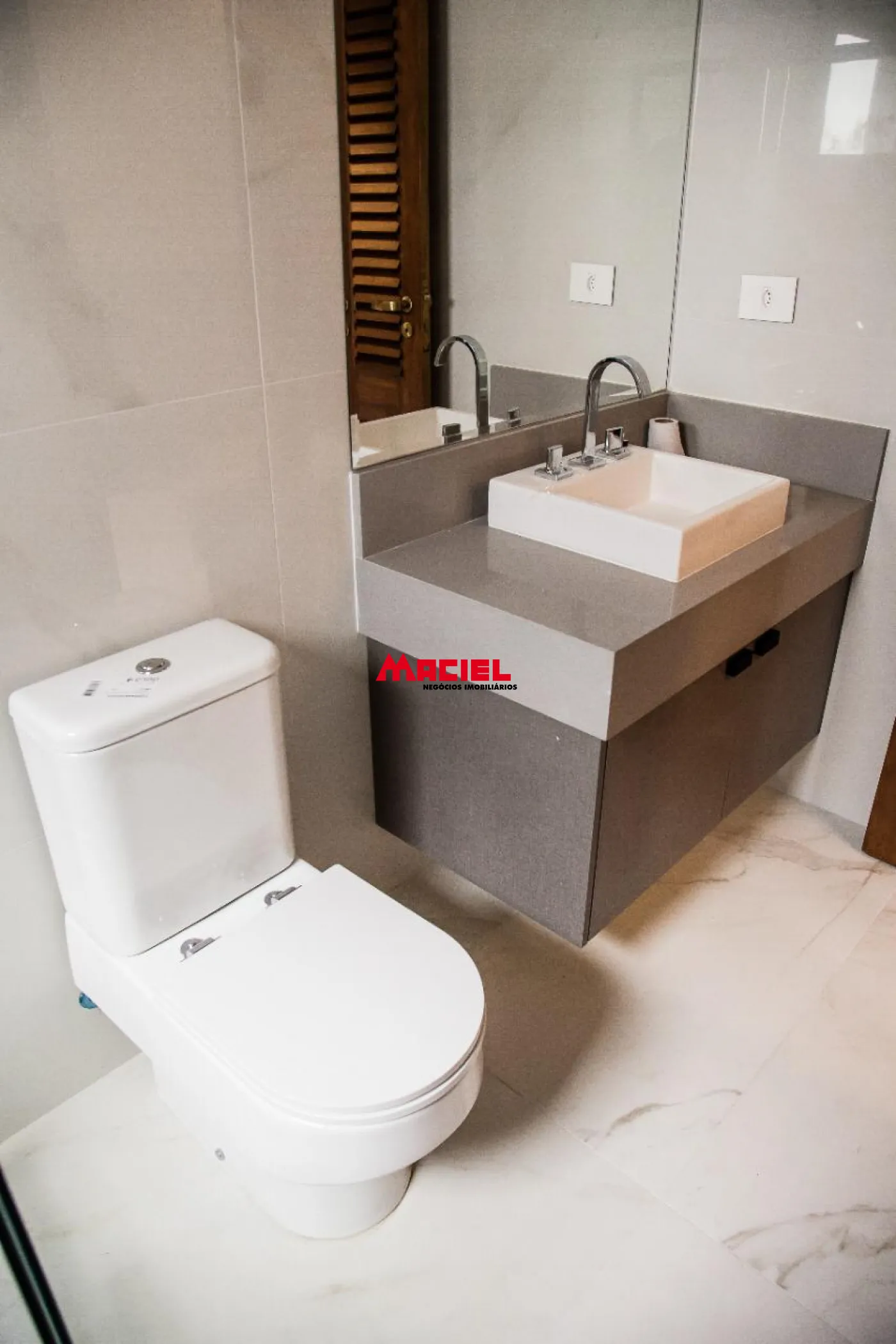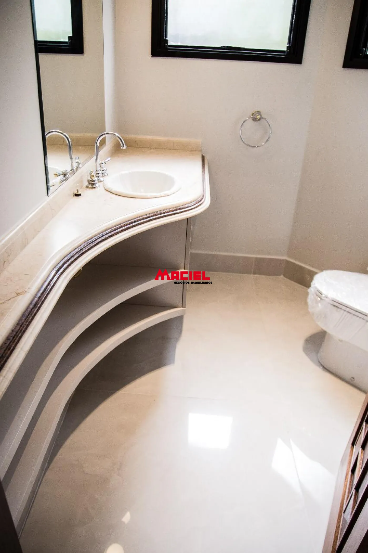 2 suítes master, ambas com banheira e 2 chuveiros e 2 pias de lavatório e armários planejados, e escritório.