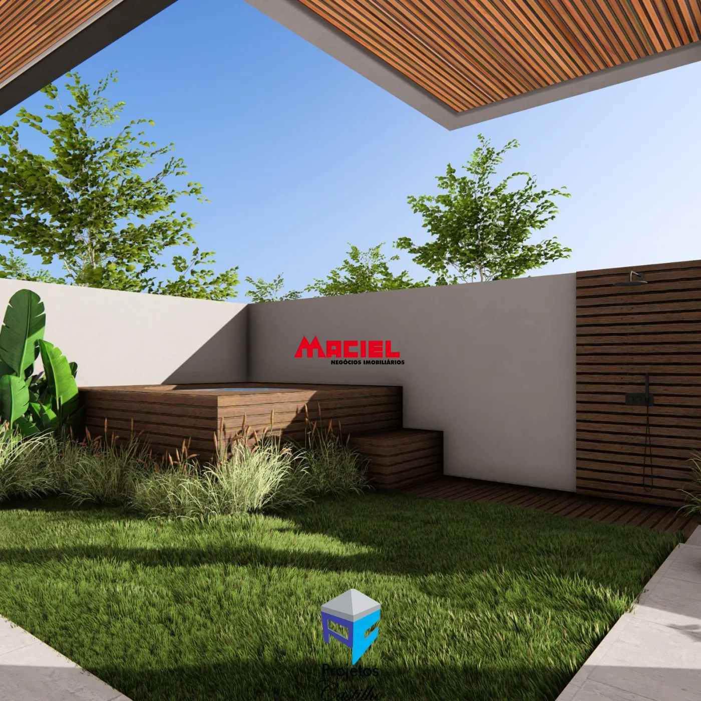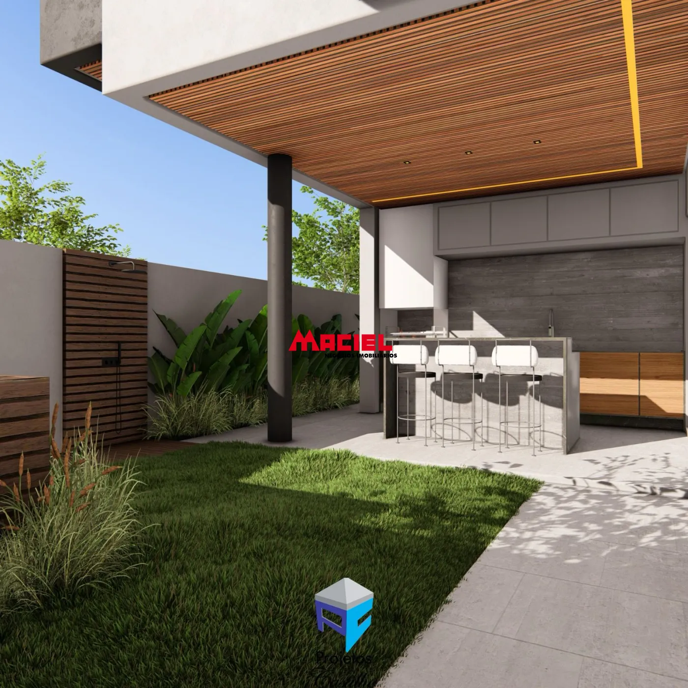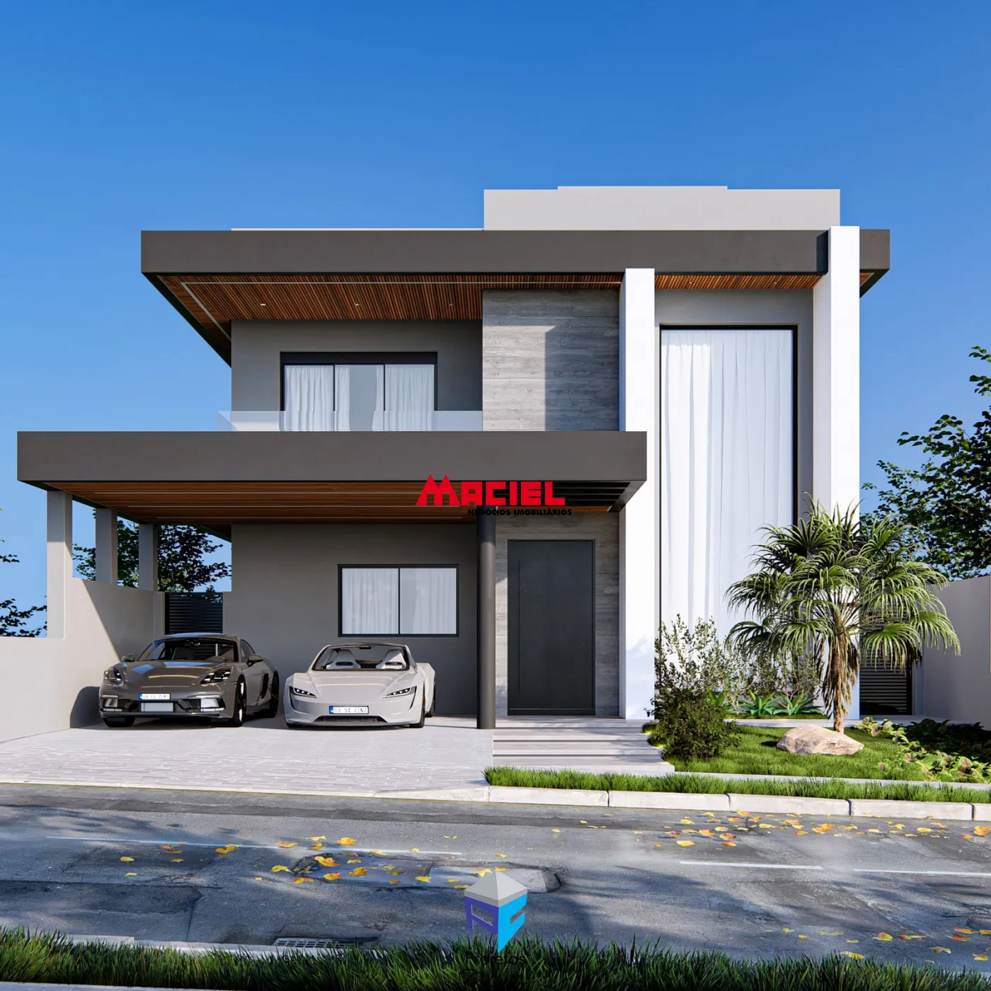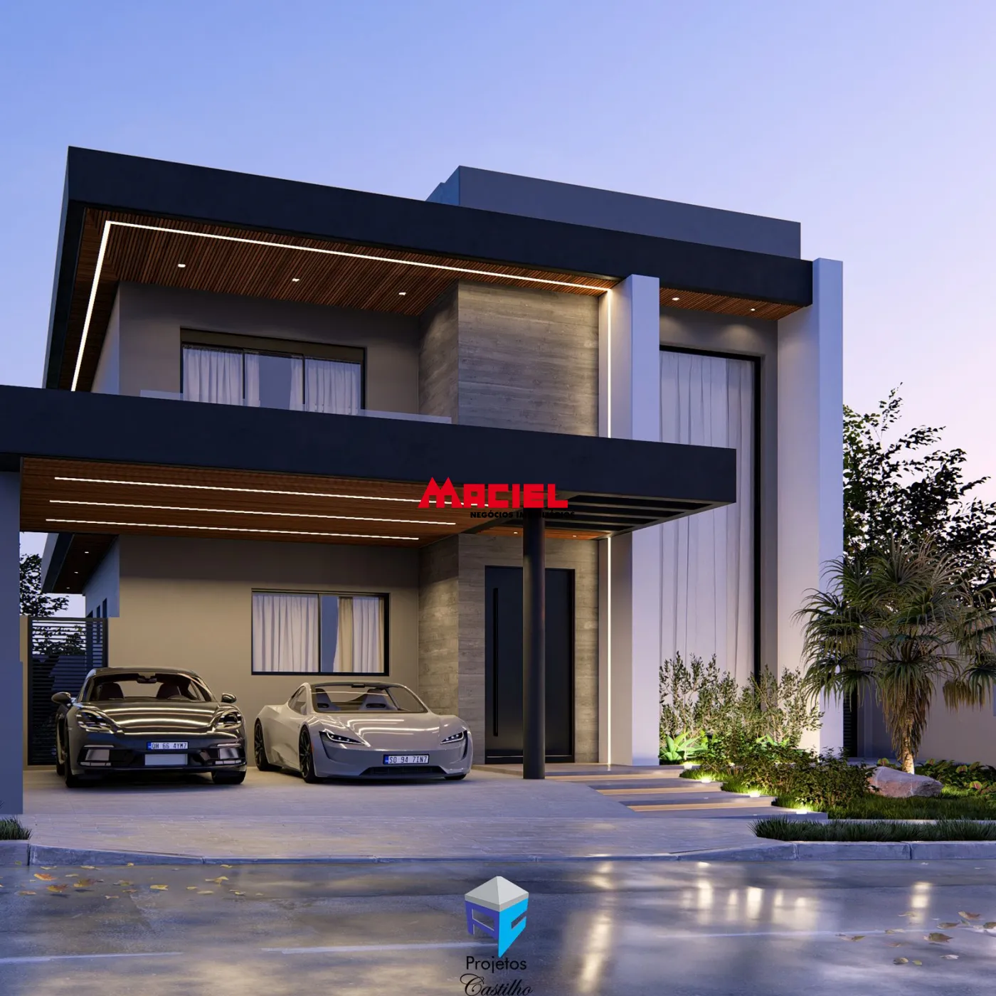 moderno e elegante. Destacam-se os detalhes em madeira no beiral duplo,