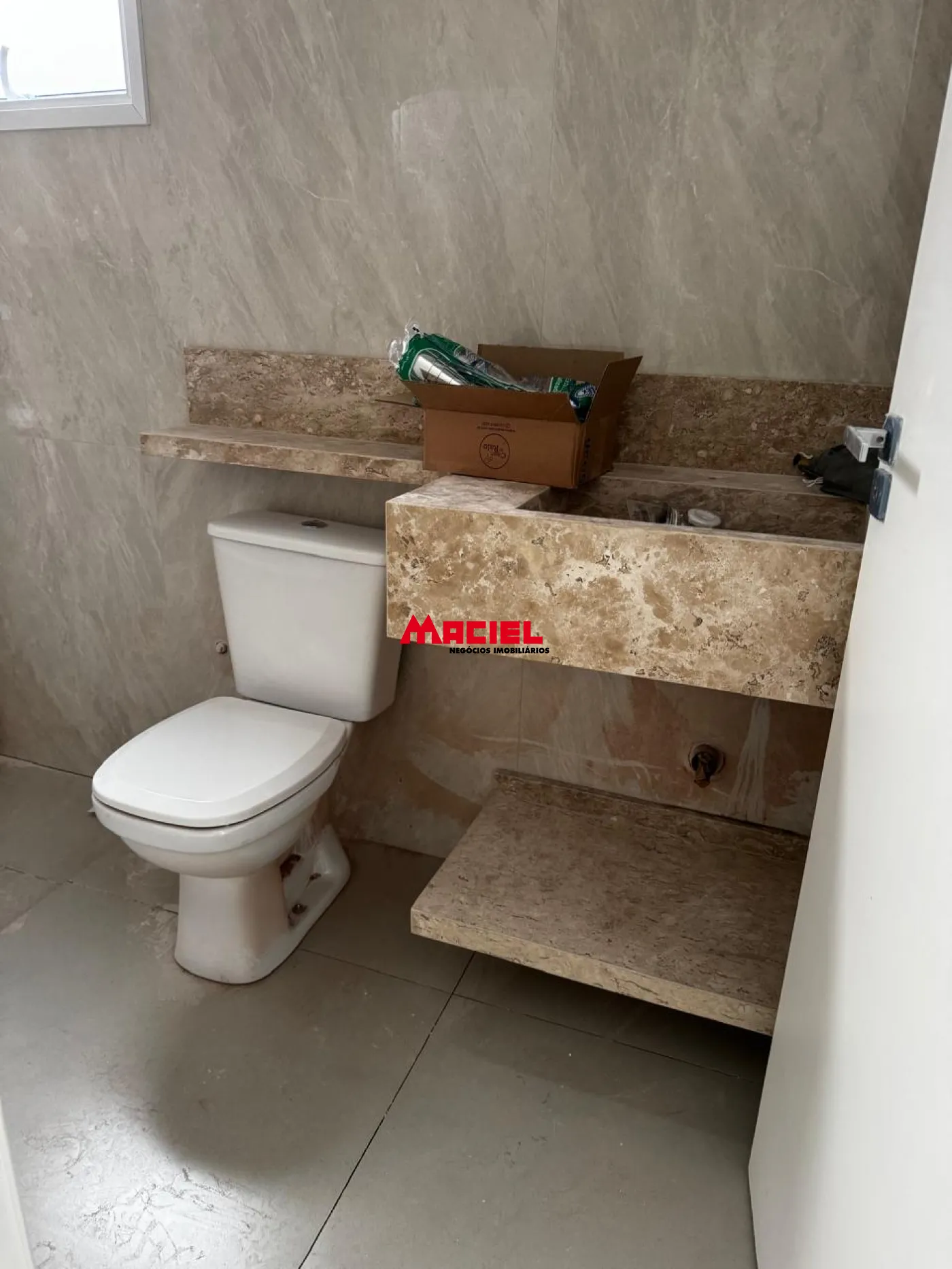 Banheiro social com bancada em travertino nacional