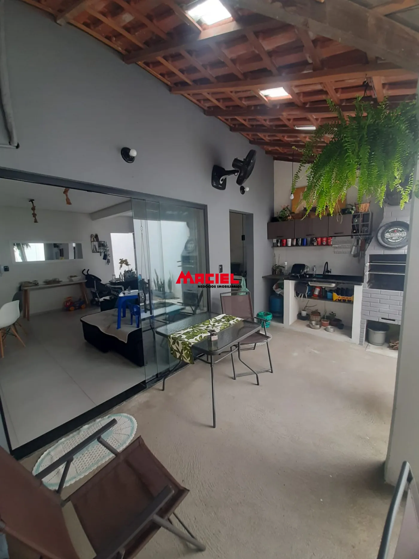 Espaçosa área gourmet coberta com pia e churrasqueira