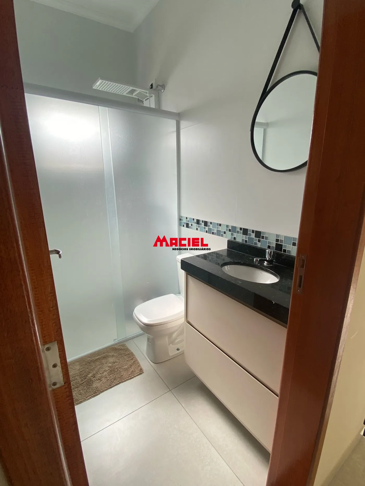 Banheiro social com móveis planejados e box em vidro jateado.