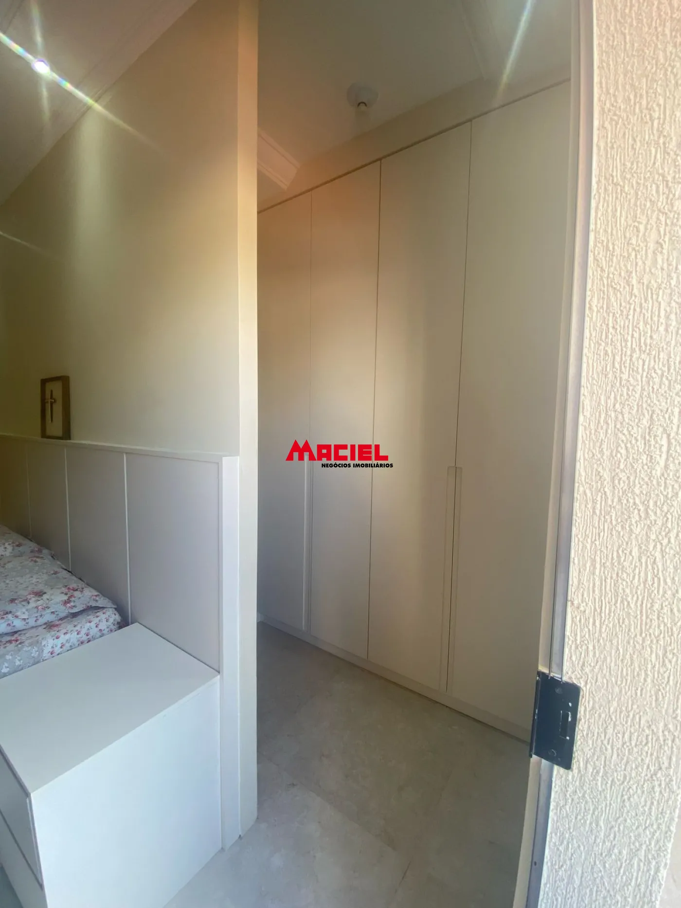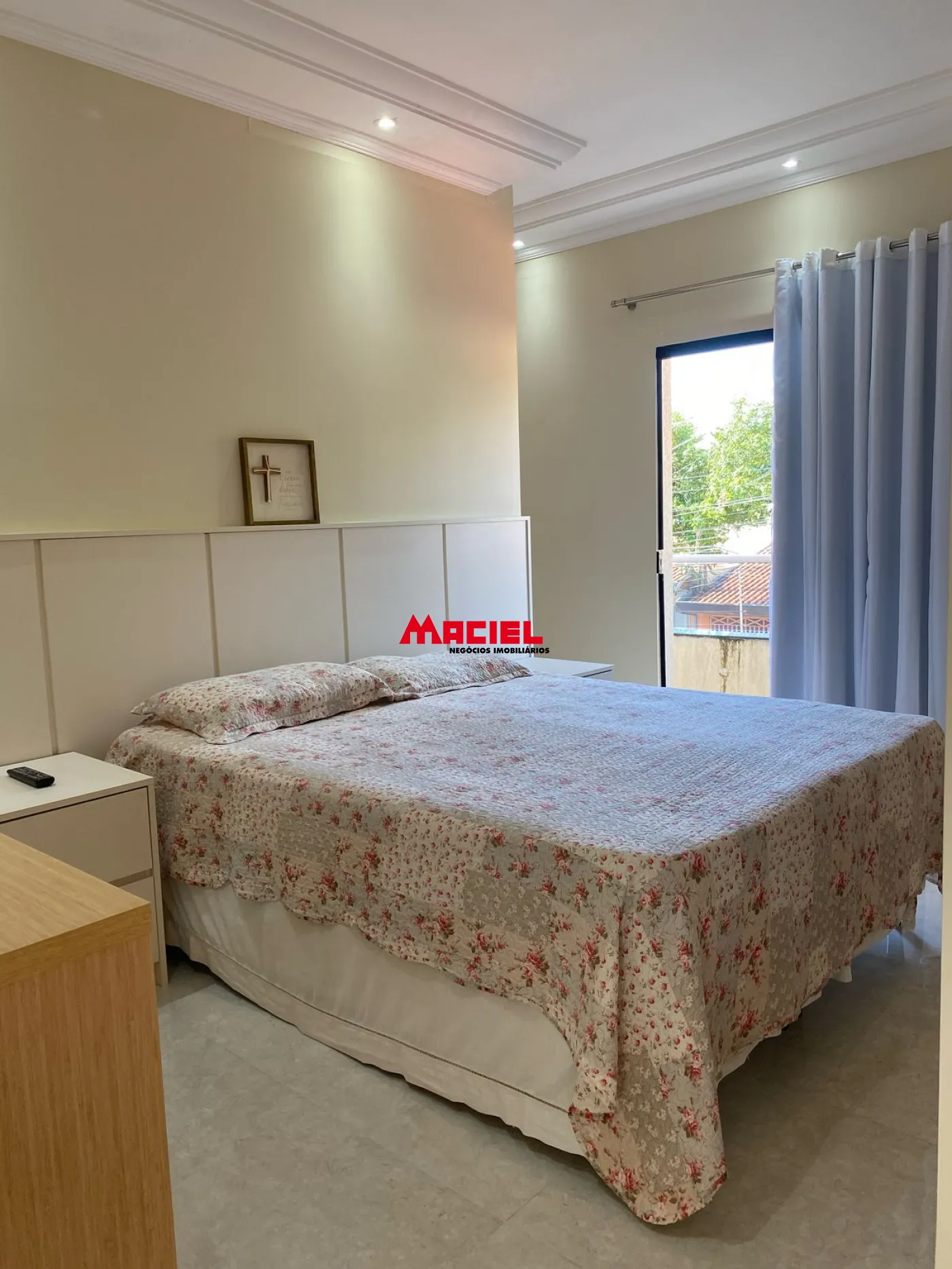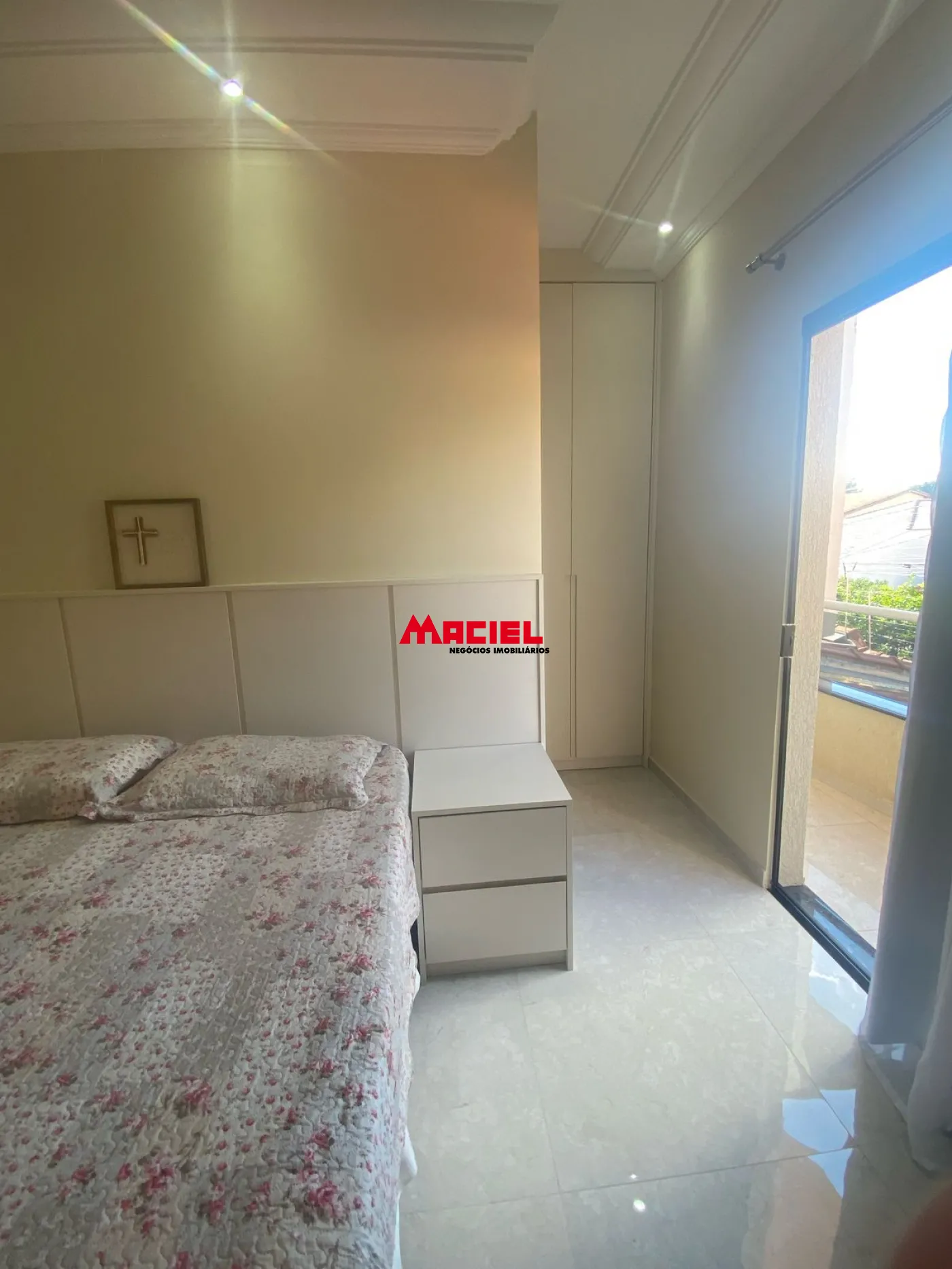 Suíte principal com armários planejados novos, cortina blackout, banheiro com espelho deslizante e box em vidro jateado, além de varanda com vista para a rua.