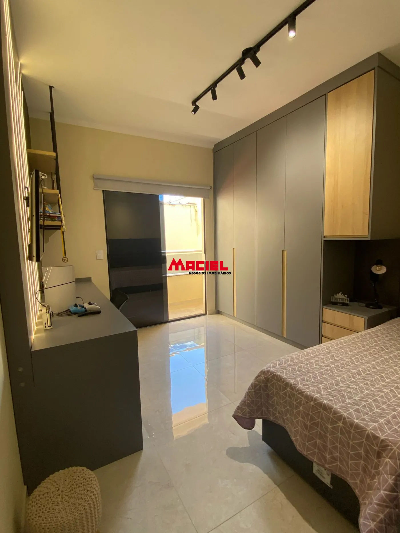 Segundo dormitório com armários planejados, mesa de trabalho com painel de LED, cortina rolo blackout e varanda voltada para a área de lazer.