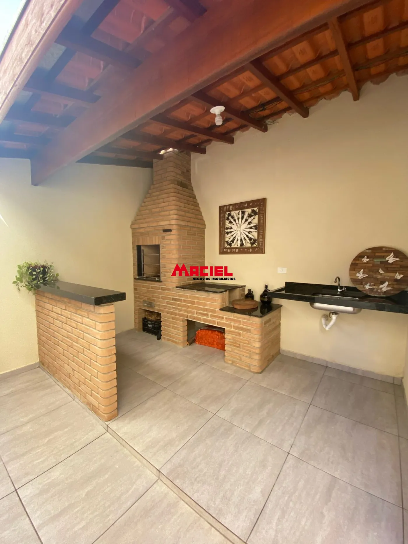 Área gourmet completa, com churrasqueira, fogão a lenha, pia de apoio e lavabo.