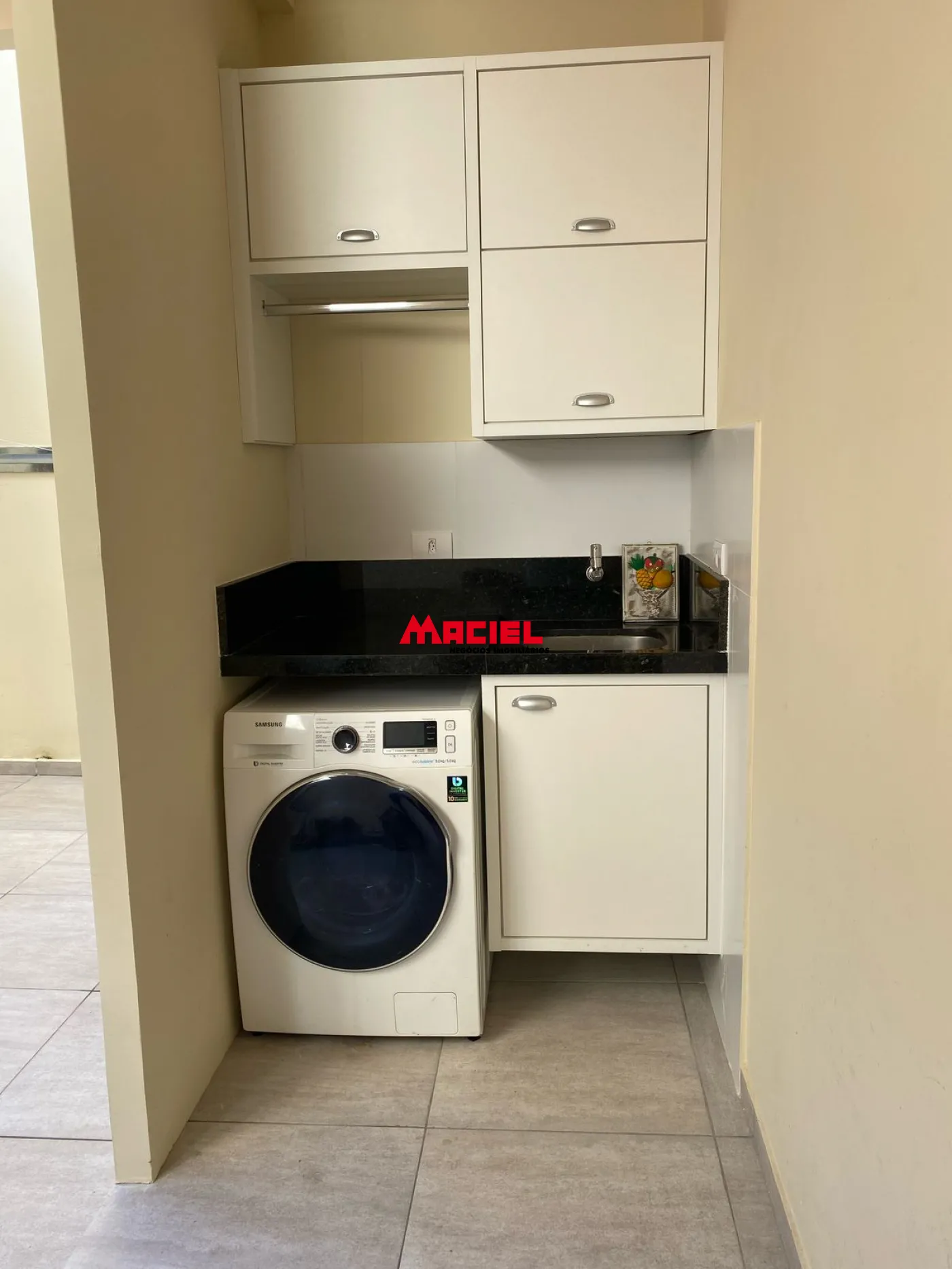 Lavanderia estilo americano, com bancada em mármore preto e armários planejados.