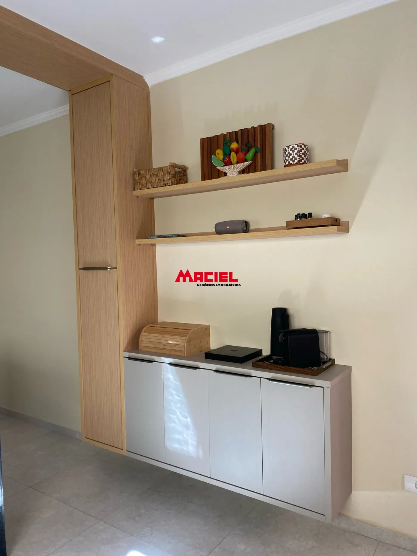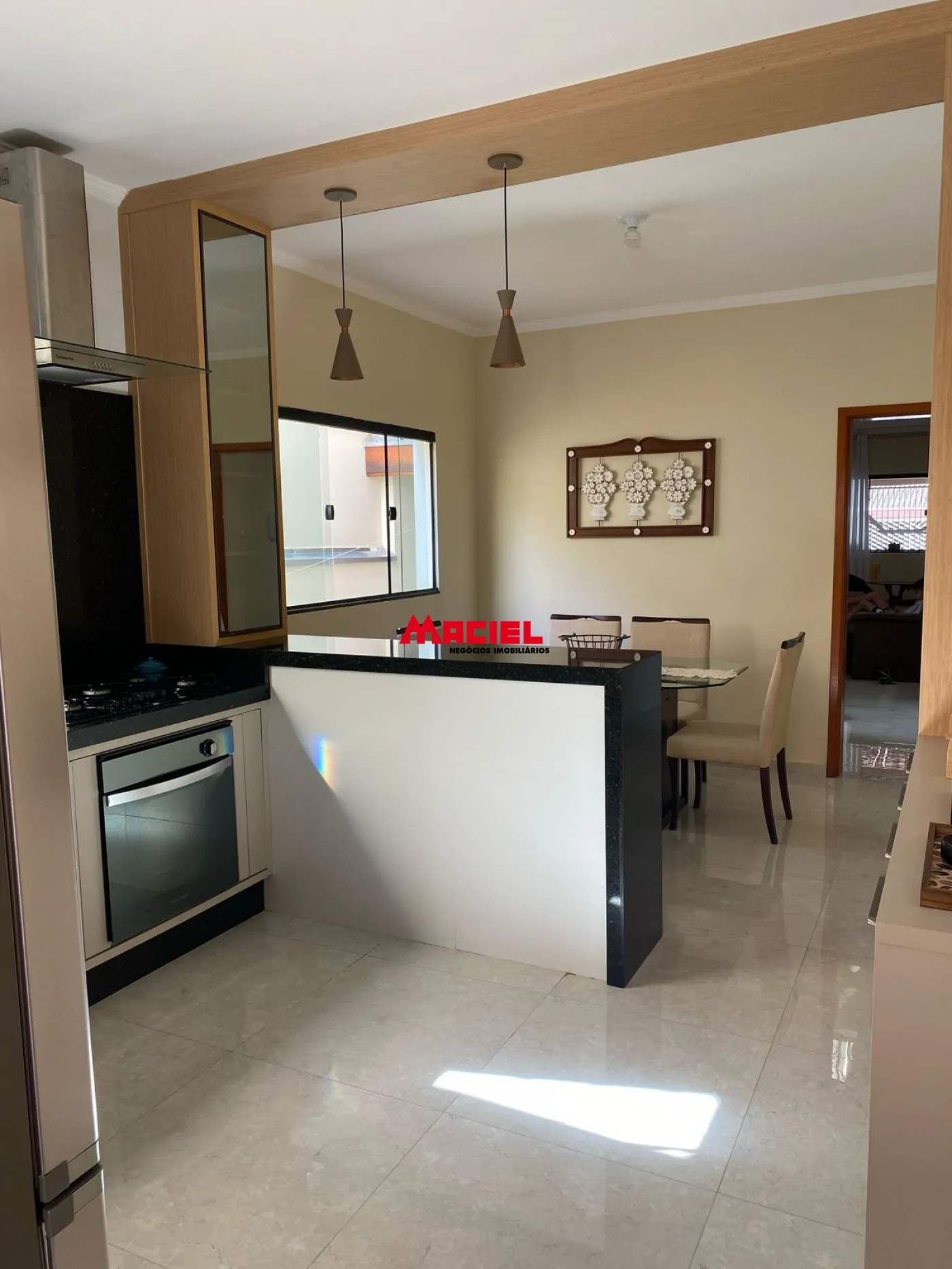 Sala de jantar integrada à cozinha, com cristaleira e espaço para mesa de 6 lugares.