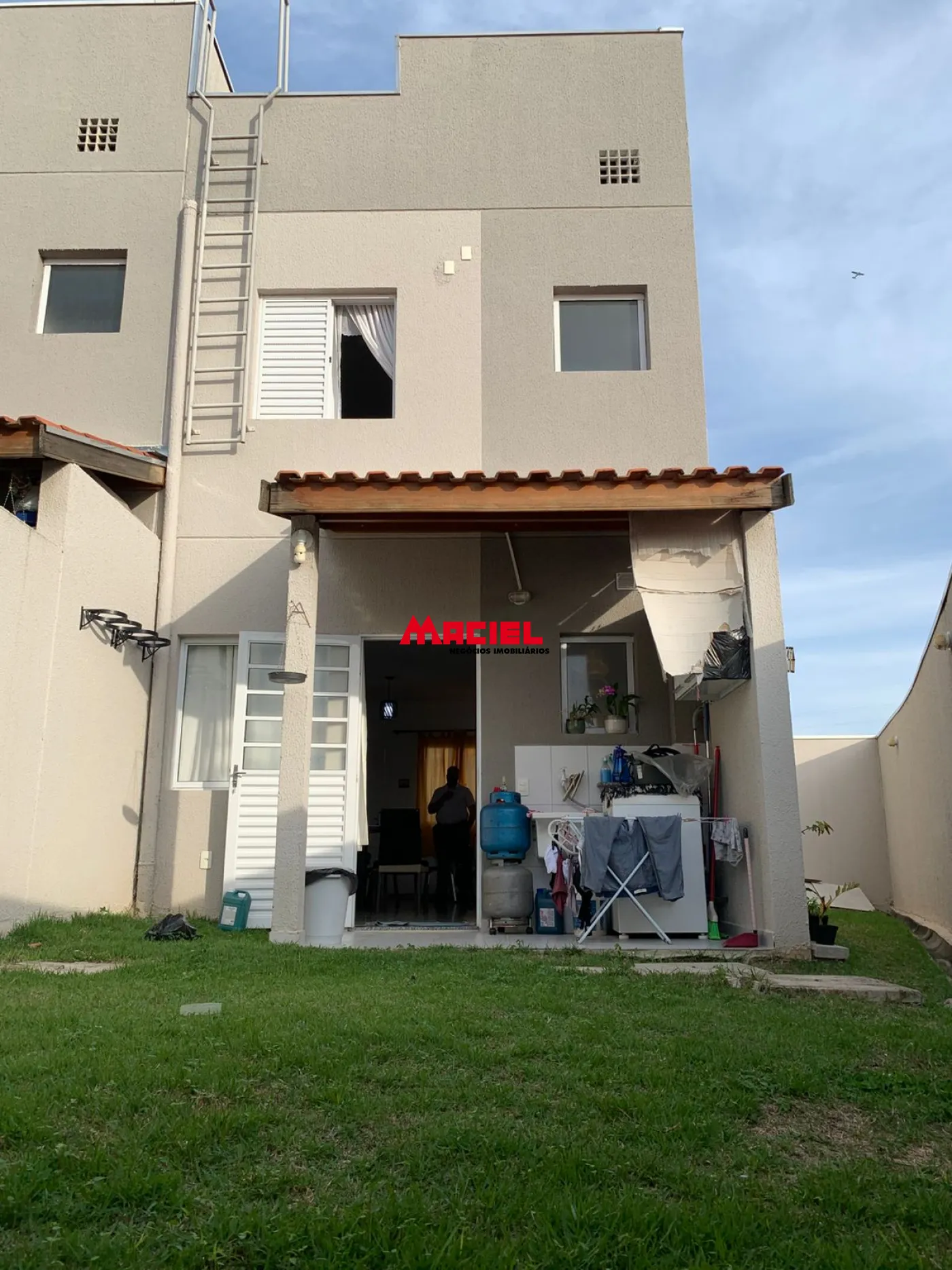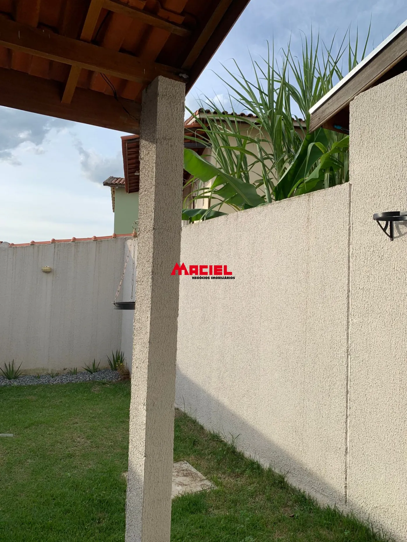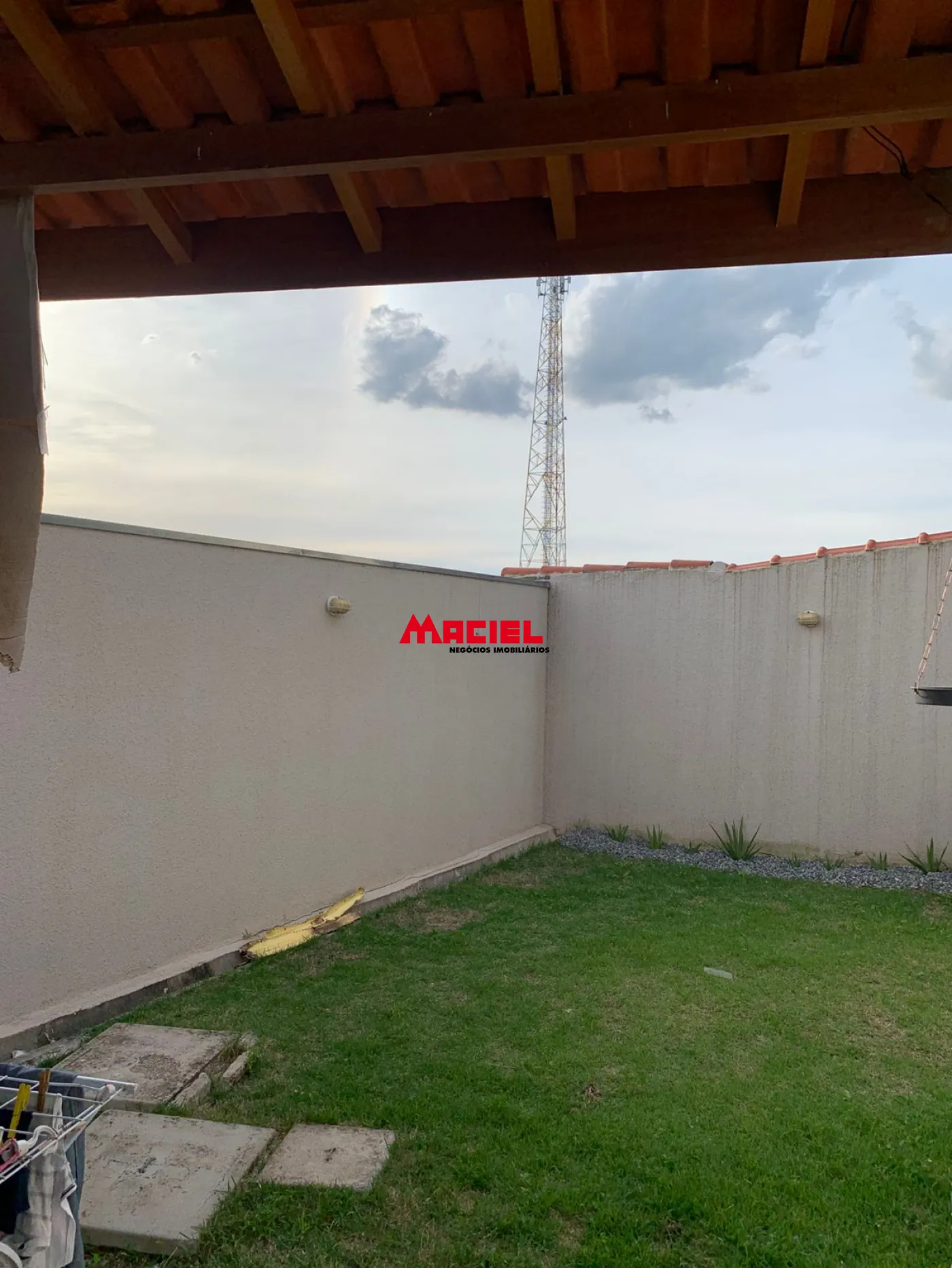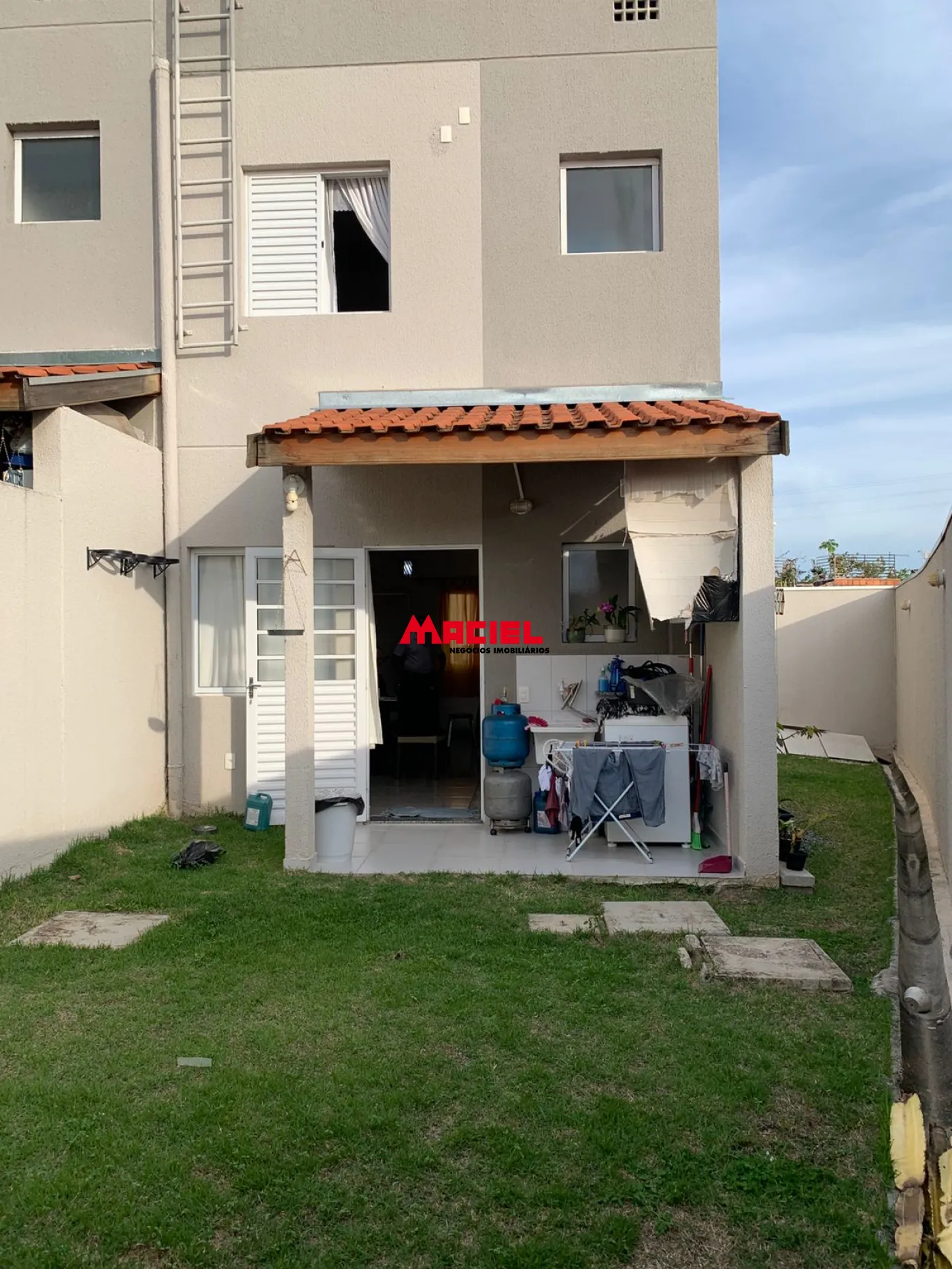 Nos fundos, há uma área de serviço coberta e um agradável quintal com grama, perfeito para momentos de lazer ou para quem possui pets.