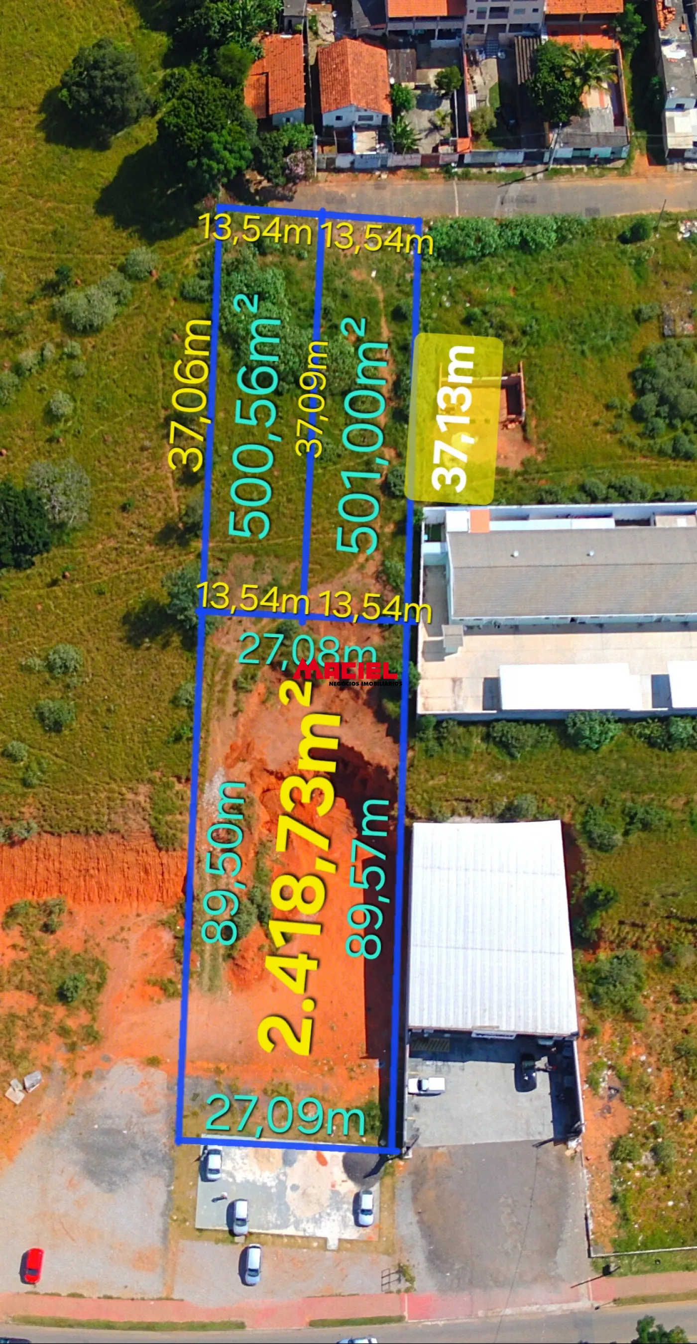Lote 1 (Esquerdo) : 500,56m², frente e fundo com 13,54m, laterais com 37,06m e 37,09m.