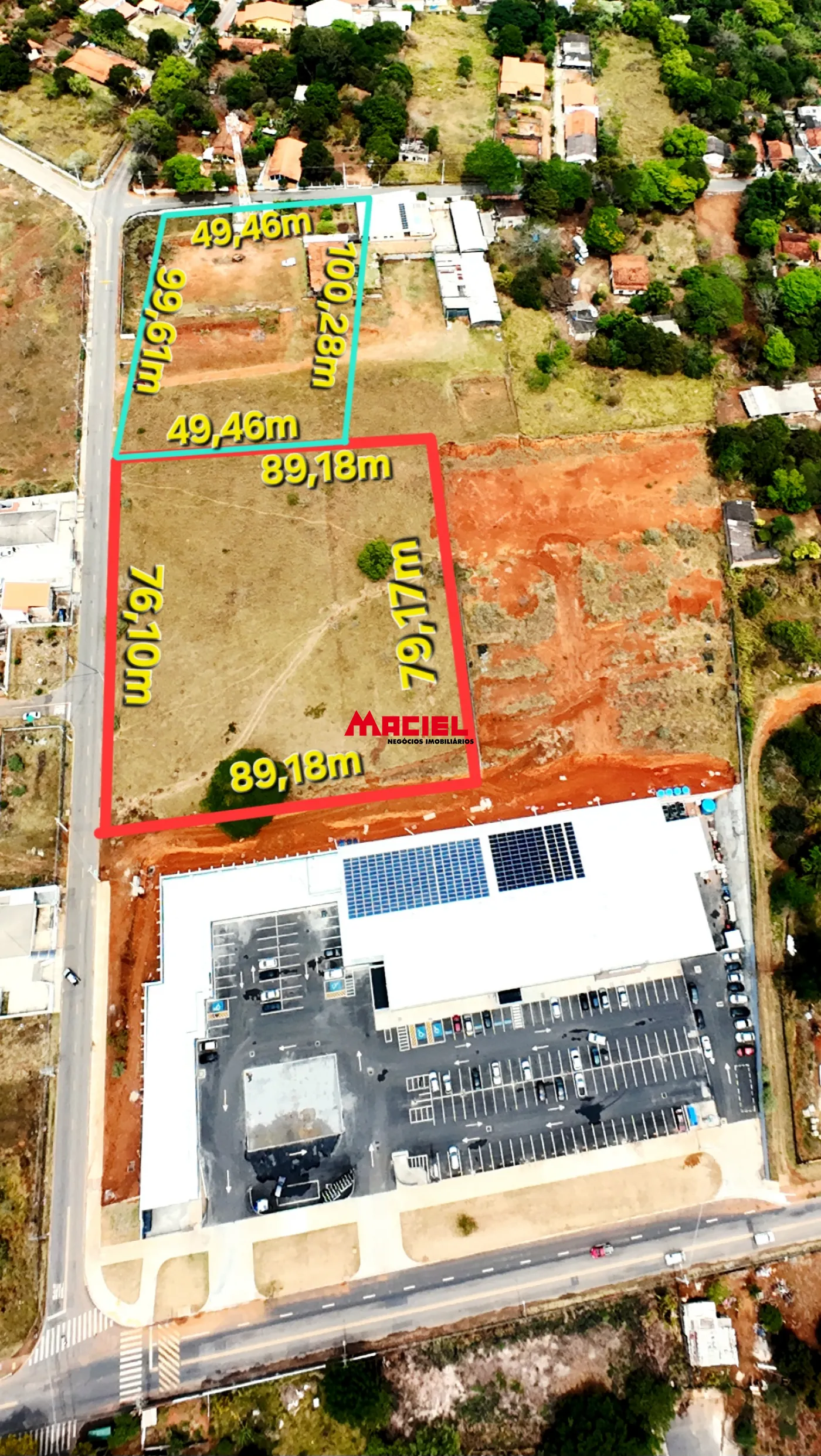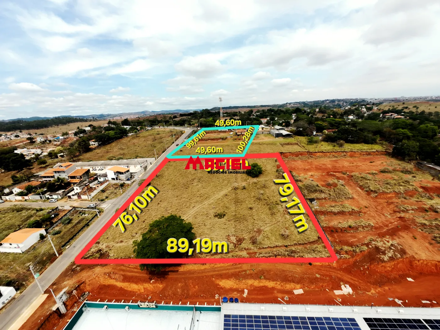 - Área 2 com 4.709,55 m², frente de 99,61 m, fundo de 100,28 m e laterais com 49,6 m